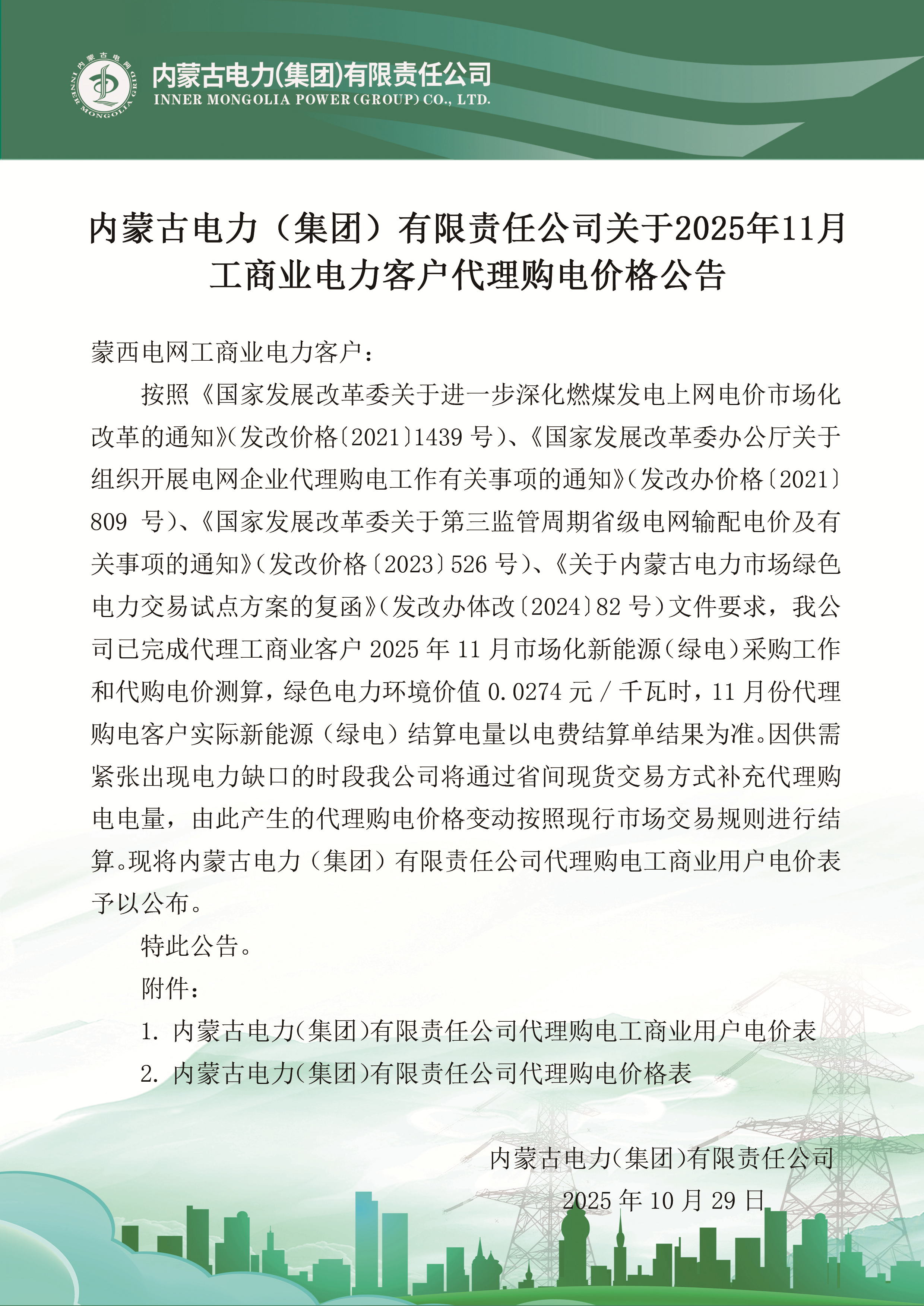 按照《国家发展改革委关于进一步深化燃煤发电上网电价市场化改革的通知》(发改价格〔2021〕1439号)、《国家发展改革委办公厅关于组织开展电网企业代理购电工作有关事项的通知》(发改办价格〔2021〕809号)、《国家发展改革委关于第三监管周期省级电网输配电价及有关事项的通知》(发改价格〔2023〕526号)、《关于内蒙古电力市场绿色电力交易试点方案的复函》(发改办体改〔2024〕82号)文件要求,我公司已完成代理工商业客户2025年11月市场化新能源(绿电)采购工作和代购电价测算,绿色电力环境价值0.0274元/千瓦时,11月份代理购电客户实际新能源(绿电)结算电量以电费结算单结果为准。因供需紧张出现电力缺口的时段我公司将通过省间现货交易方式补充代理购电电量,由此产生的代理购电价格变动按照现行市场交易规则进行结算。现将内蒙古电力(集团)有限责任公司代理购电工商业用户电价表予以公布。