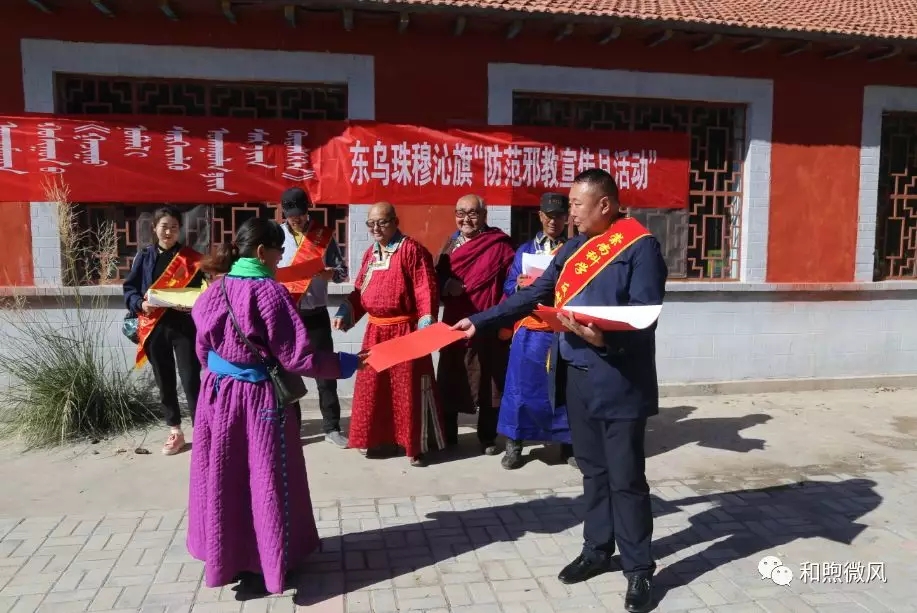 按照东乌旗反邪教宣传月活动部署,9月13日上午,旗民宗局和反邪教协会佛教支会在道特淖尔镇新庙(密宗广普寺)开展了反邪教集中宣传活动。