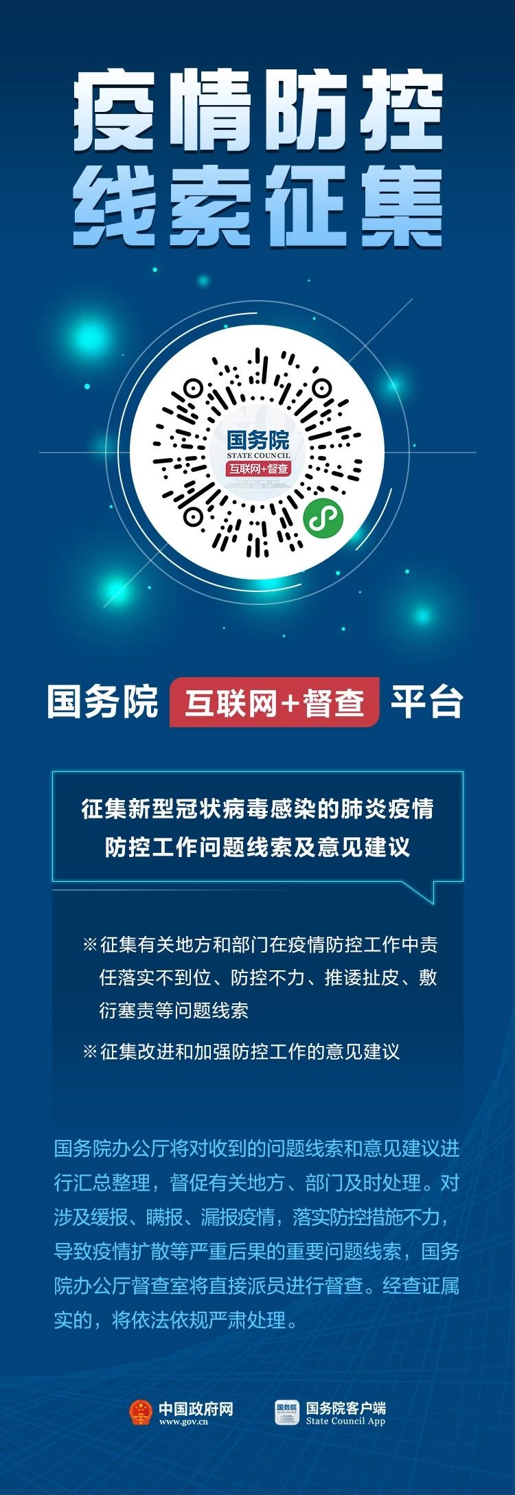 为贯彻落实党中央、国务院重要决策部署,切实做好新型冠状病毒感染的肺炎疫情防控工作,按照有关工作要求,国务院办公厅从即日起在国务院“互联网+督查”平台面向社会征集有关地方和部门在疫情防控工作中责任落实不到位、防控不力、推诿扯皮、敷衍塞责等问题线索,以及改进和加强防控工作的意见建议。