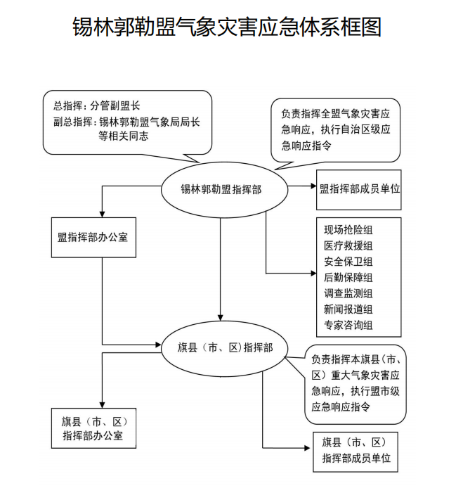 锡林郭勒盟行署成立锡林郭勒盟人工影响天气与气象灾害防御指挥部(以下简称“盟指挥部”),统一领导和指挥气象灾害监测、预报预警、分析研判和应急处置工作。总指挥由锡林郭勒盟行署分管副盟长担任,锡林郭勒盟气象局局长等相关负责同志担任副总指挥。