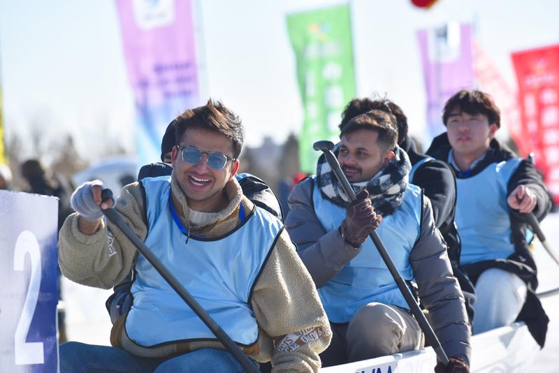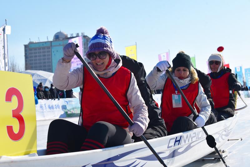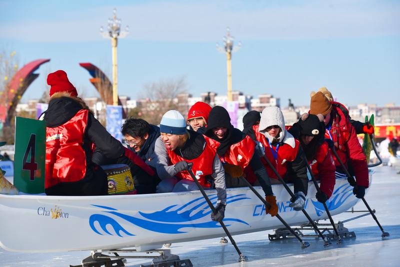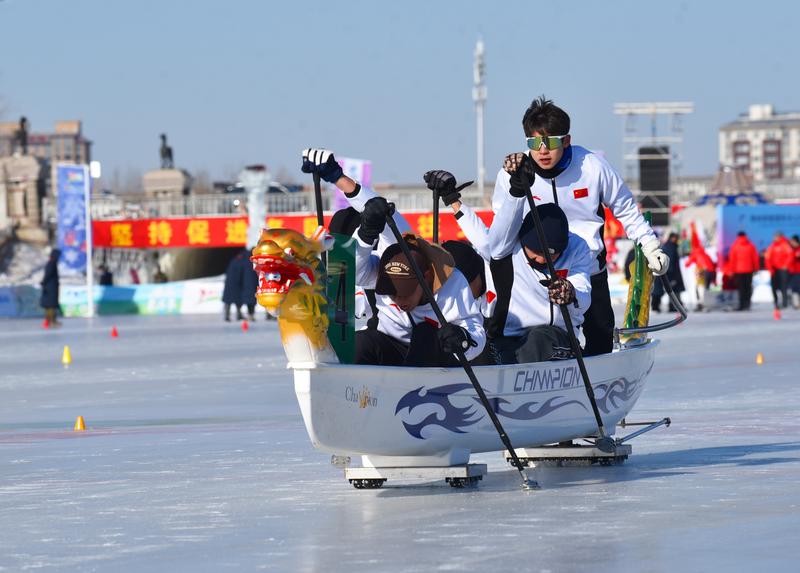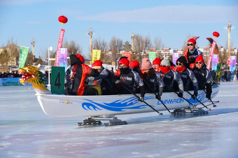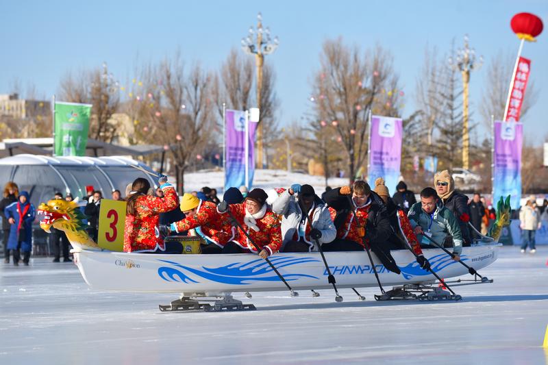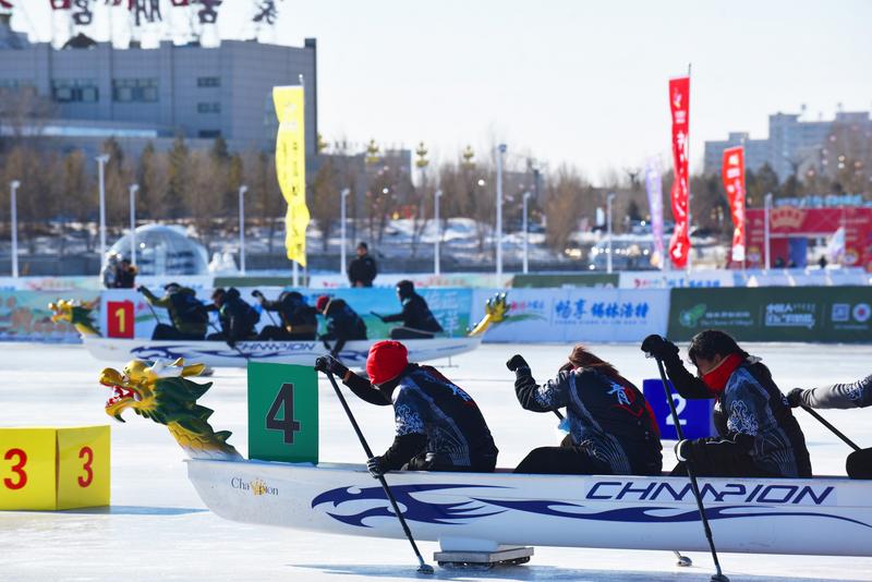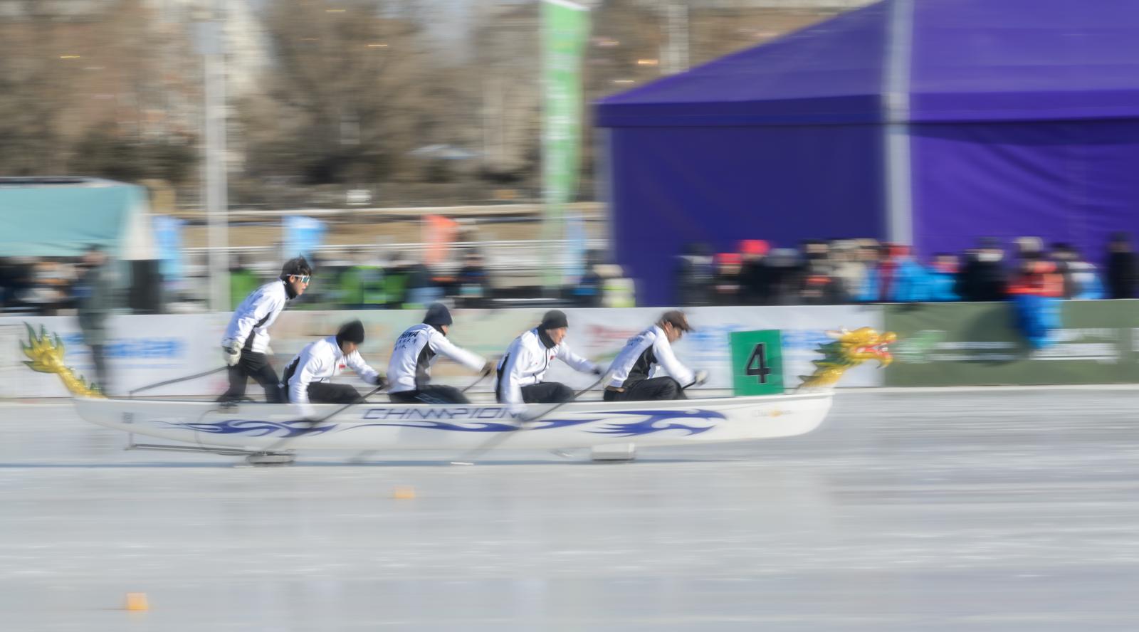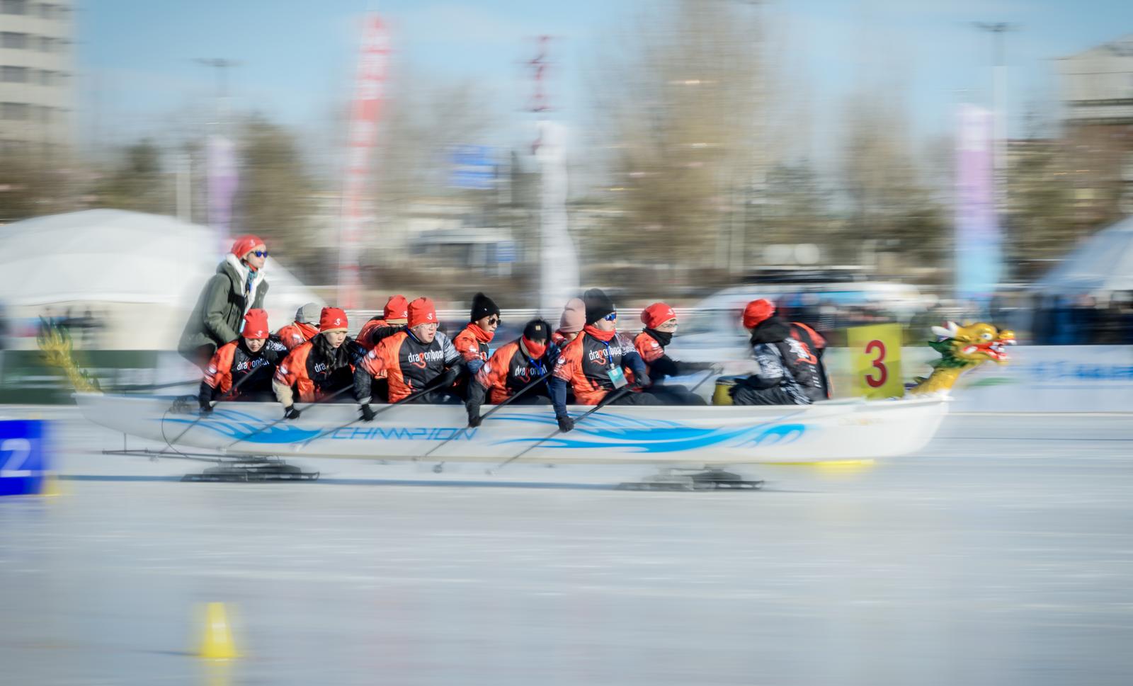 比赛项目丰富多样,设有12人冰上龙舟100米直道赛、5人冰上龙舟100米直道赛、12人冰上龙舟300米漂移折返赛等。比赛首日,200米直道赛公开组12人冰上龙舟预赛率先打响,五组选手全力争胜。此后的公开组5人冰上龙舟200米直道赛也依次进行,在复赛和半决赛中,各队运动员将团结一心、奋力冲刺,为最高荣誉拼搏。