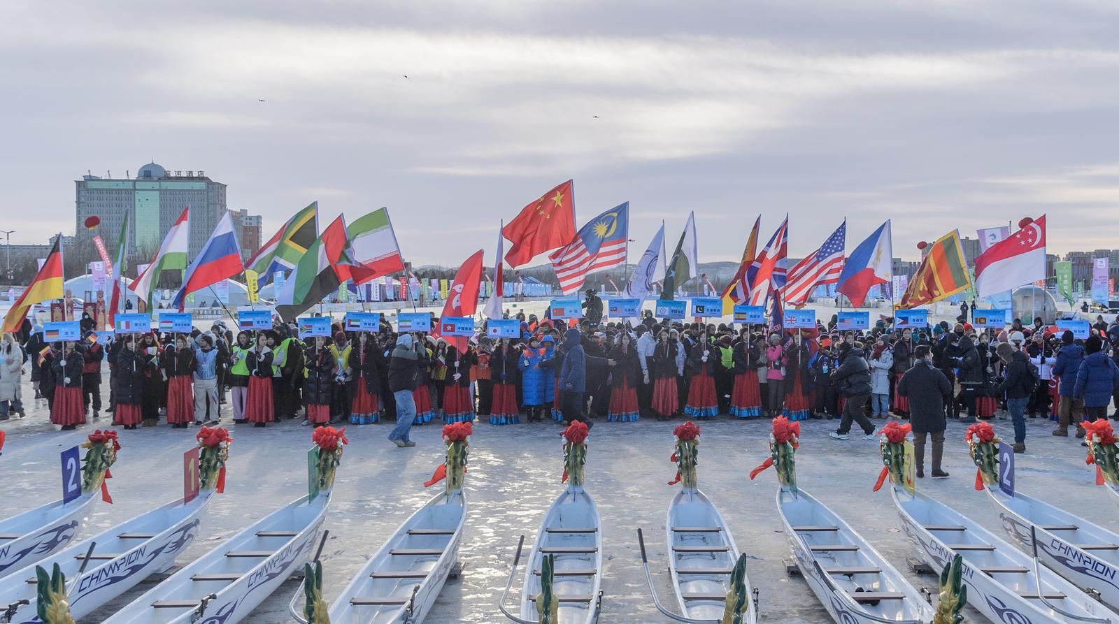 1月20日,锡林郭勒国际冰上龙舟锦标赛在锡林浩特市隆重拉开帷幕,现场彩旗飘扬、人头攒动、热闹非凡,3000余名游客群众来到现场观赛,一场汇聚全球顶尖冰上龙舟队伍的冰上龙舟盛会正式开启。