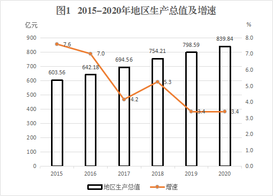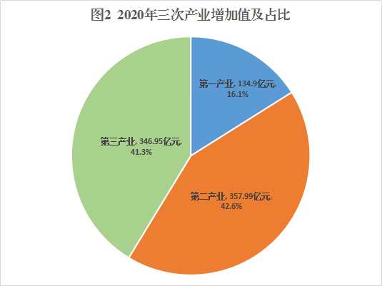 初步核算,全年地区生产总值完成839.84亿元,按可比价计算,比上年增长3.4%。其中,第一产业增加值134.90亿元,增长1.3%;第二产业增加值357.99亿元,增长9.2%;第三产业增加值346.95亿元,下降1.5%。三次产业比例为16.1:42.6:41.3。