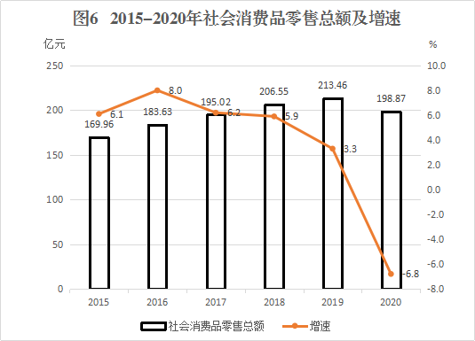 全年社会消费品零售总额198.87亿元,比上年下降6.8%。按经营地分,城镇消费品零售额174.61亿元,下降7.6%;农村牧区消费品零售额24.26亿元,下降1.0%。按消费类型分,商品零售额172.68亿元,下降4.7%;餐饮收入26.19亿元,下降19.0%。