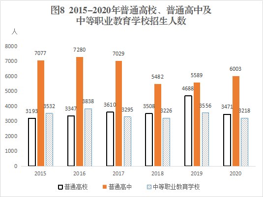2020年,全盟普通高校1所,招生3471人,在校生10332人,毕业生3243人。中等职业教育学校12所,招生3218人,在校生9051人,毕业生2612人。普通高中16所,招生6003人,在校生17029人,毕业生6916人。初中22所,招生9671人,在校生28685人,毕业生9212人。小学70所,招生11147人,在校生61168人,毕业生9944人。幼儿园在园幼儿28448人。