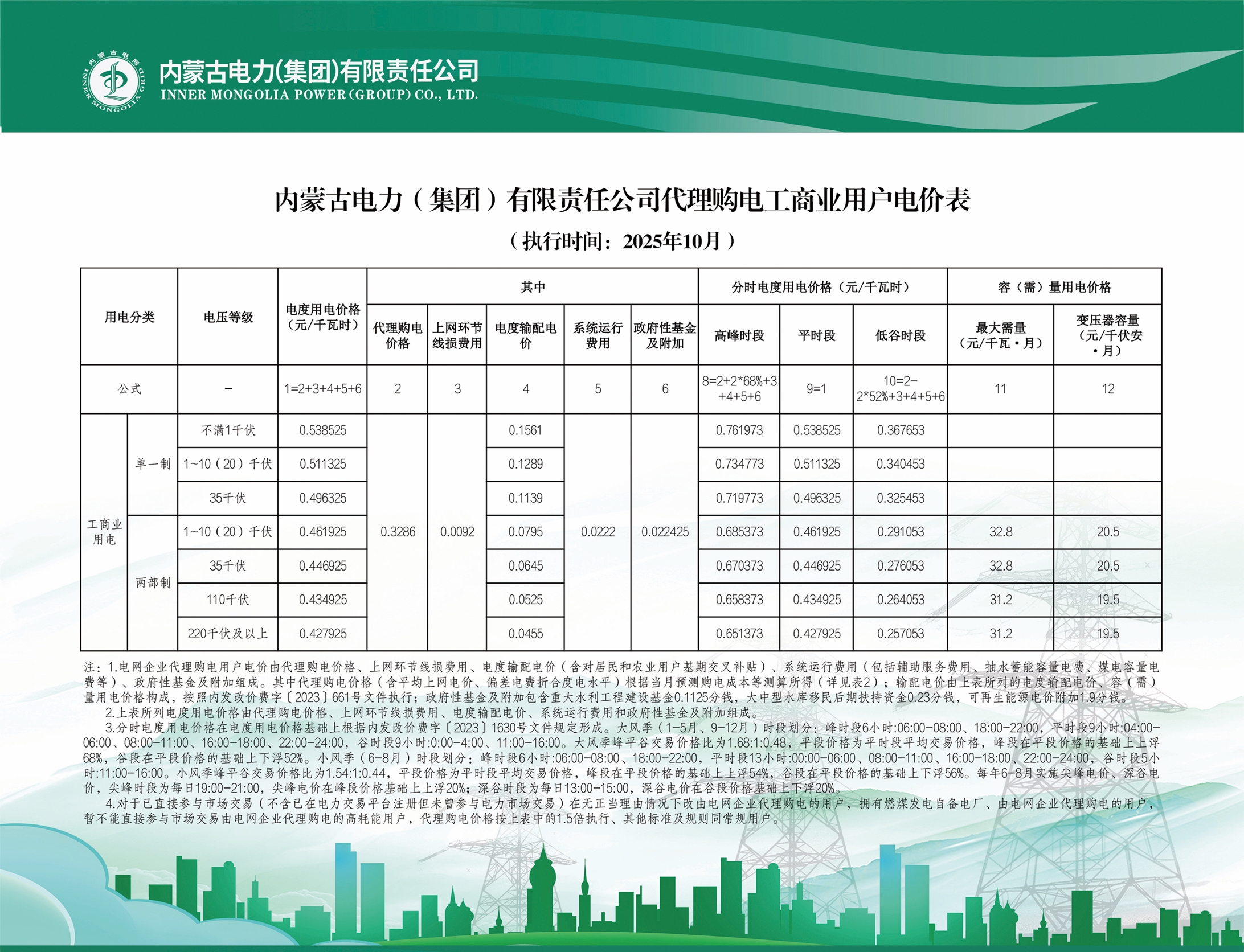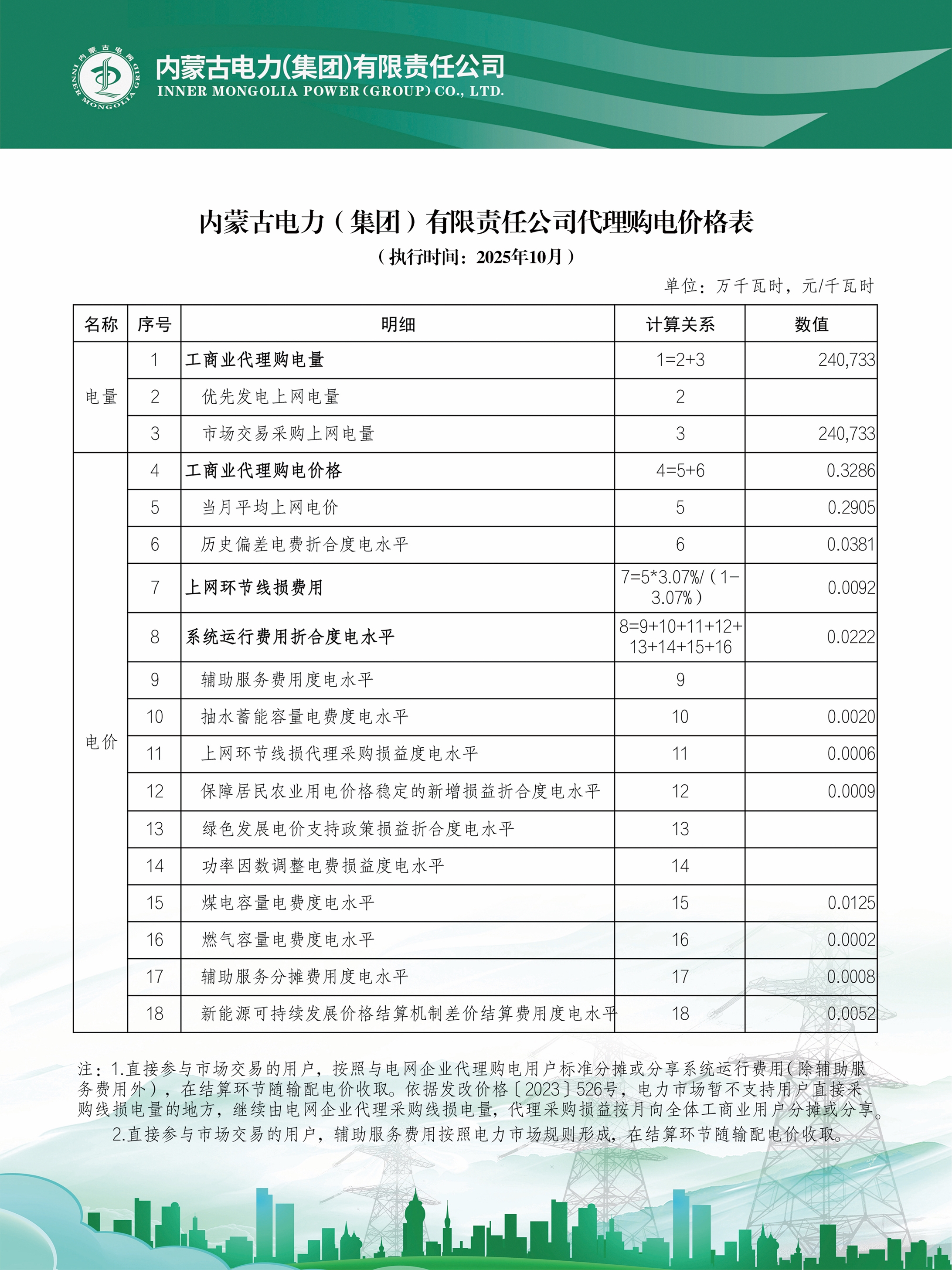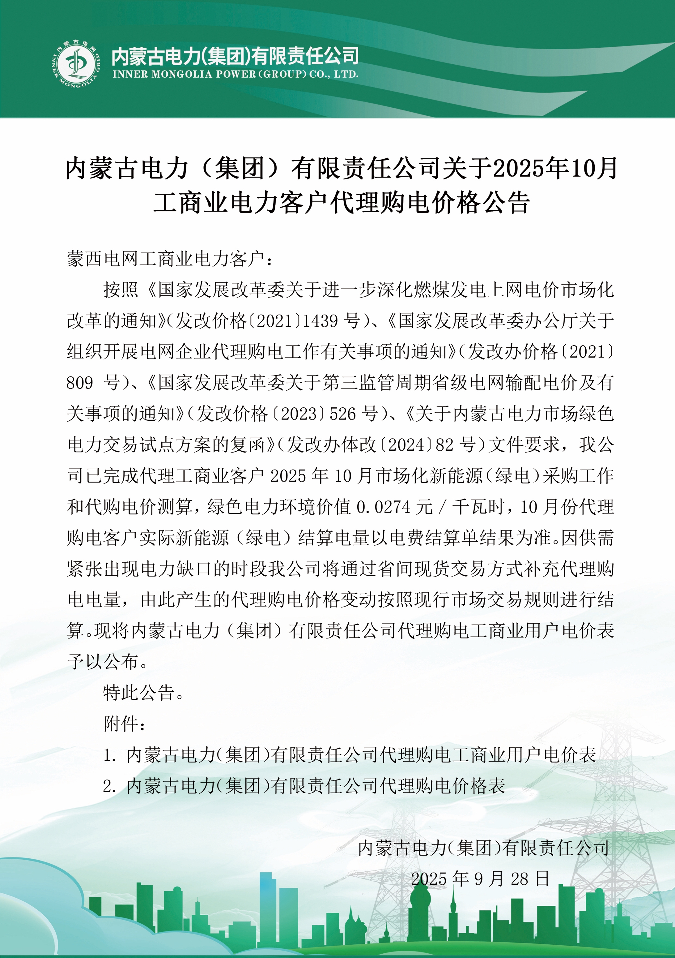 按照《国家发展改革委关于进一步深化燃煤发电上网电价市场化改革的通知》(发改价格〔2021〕1439号)、《国家发展改革委办公厅关于组织开展电网企业代理购电工作有关事项的通知》(发改办价格〔2021〕809号)、《国家发展改革委关于第三监管周期省级电网输配电价及有关事项的通知》(发改价格〔2023〕526号)、《关于内蒙古电力市场绿色电力交易试点方案的复函》(发改办体改〔2024〕82号)文件要求,我公司已完成代理工商业客户2025年10月市场化新能源(绿电)采购工作和代购电价测算,绿色电力环境价值0.0274元/千瓦时,10月份代理购电客户实际新能源(绿电)结算电量以电费结算单结果为准。因供需紧张出现电力缺口的时段我公司将通过省间现货交易方式补充代理购电电量,由此产生的代理购电价格变动按照现行市场交易规则进行结算。现将内蒙古电力(集团)有限责任公司代理购电工商业用户电价表予以公布。