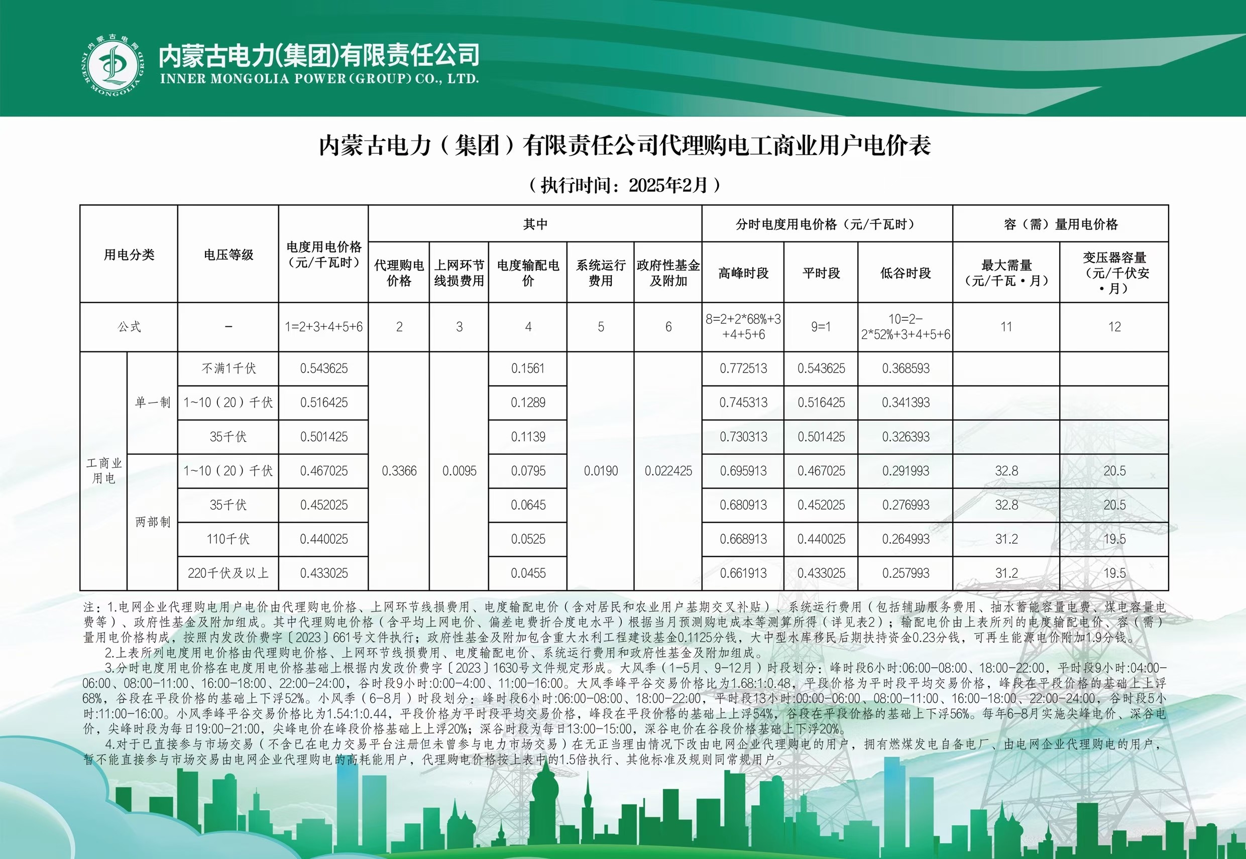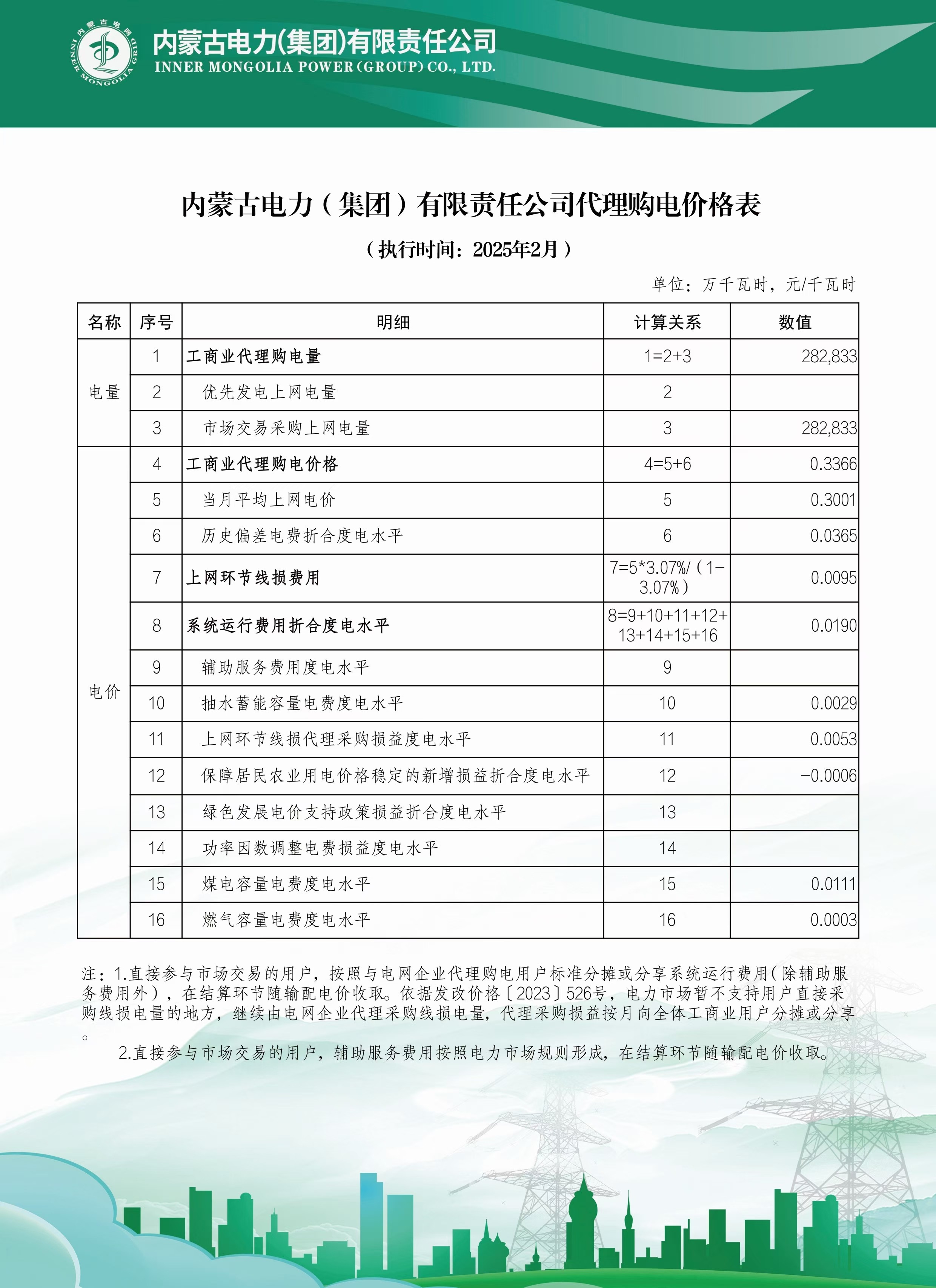 按照《国家发展改革委关于进一步深化燃煤发电上网电价市场化改革的通知》(发改价格〔2021〕1439号)、《国家发展改革委办公厅关于组织开展电网企业代理购电工作有关事项的通知》(发改办价格〔2021〕809号)、《国家发展改革委关于第三监管周期省级电网输配电价及有关事项的通知》(发改价格〔2023〕526号)、《关于内蒙古电力市场绿色电力交易试点方案的复函》(发改办体改〔2024〕82号)文件要求,我公司已完成代理工商业客户2025年2月市场化新能源(绿电)采购工作和代购电价测算,绿色电力环境价值0.0282元/千瓦时,2月份代理购电客户实际新能源(绿电)结算电量以电费结算单结果为准。因供需紧张出现电力缺口的时段我公司将通过省间现货交易方式补充代理购电电量,由此产生的代理购电价格变动按照现行市场交易规则进行结算。现将内蒙古电力(集团)有限责任公司代理购电工商业用户电价表予以公布。