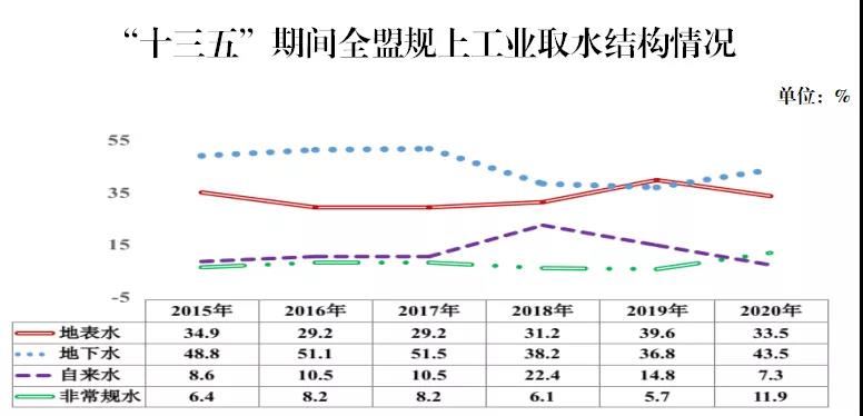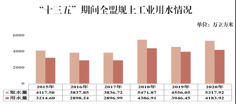 2020年,全盟规上工业取水量和用水量分别达到5317.92万立方米和4183.92万立方米,年均分别增长5.2%和5.4%,与工业增加值实现同步增长,较好地支撑了工业经济的发展。
