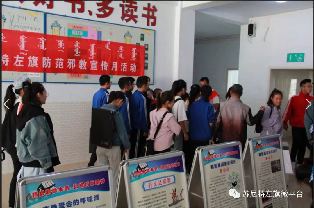 9月18日,锡盟反邪教协会苏尼特左旗分会、旗科协、工会、团委、妇联等相关单位在旗综合高级中学联合举办了反邪教知识、科普知识、网络安全知识等进校园活动。反邪教知识进校园是旗反邪教宣传月期间的一项重要内容,旨在使广大师生进一步提高反邪教意识,增强抵御邪教的能力,净化学生成长环境。