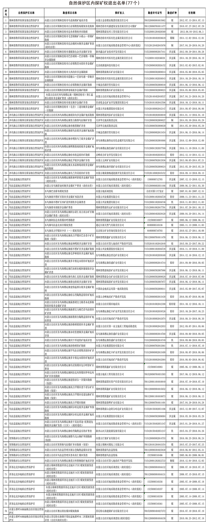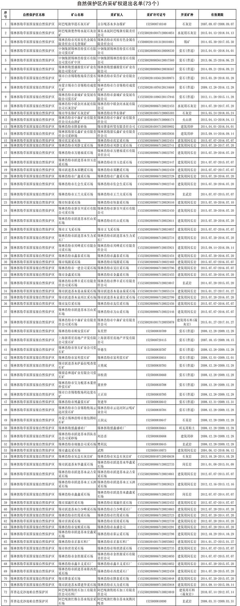 根据《中华人民共和国矿产资源法》、《中华人民共和国自然保护区条例》等法律法规和《内蒙古自治区自然保护区内工矿企业退出方案》(内政发电〔2017〕28号)、《锡林郭勒盟自然保护区内工矿企业退出方案》(锡署发〔2017〕126号)要求,经研究,决定对锡林郭勒草原国家级自然保护区、古日格斯台国家级自然保护区、浑善达克沙地柏自治区级自然保护区、都呼木柄扁桃自治区级自然保护区、贺斯格淖尔湿地自治区级自然保护区、乌拉盖湿地自治区级自然保护区6个自然保护区内的73个采矿权和77个探矿权依法退出,现予以公告。