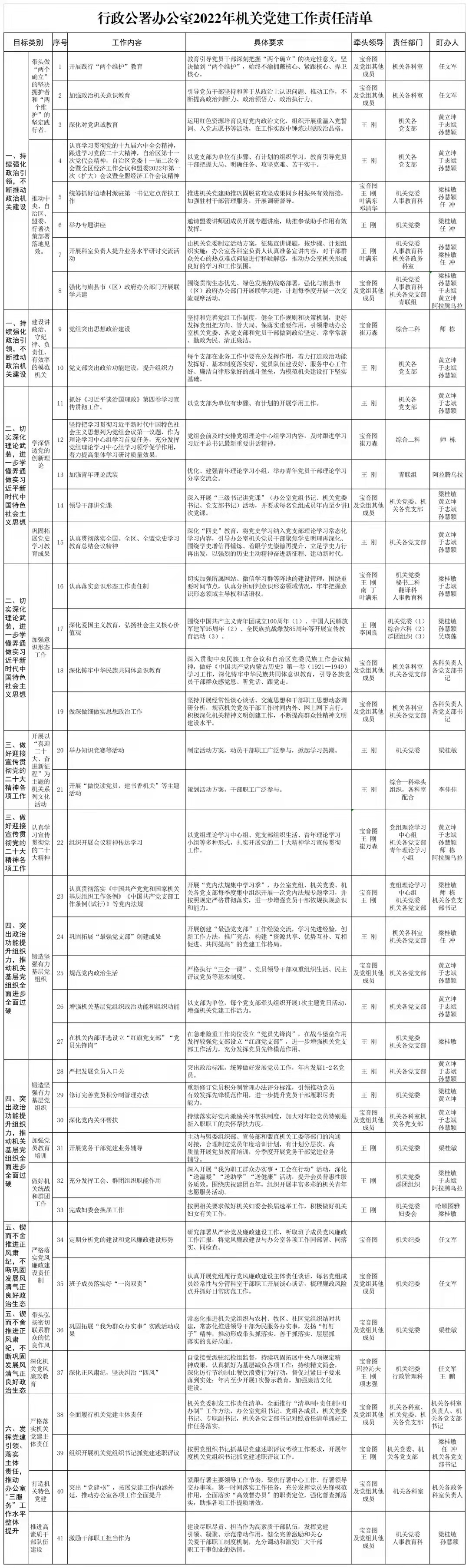 “清单制+责任制+盯办制”工作方法,即将《工作要点》中所列出的17项重点工作细化为41项具体任务清单,主要以机关党的政治建设、强化思想理论武装、做好迎接宣传贯彻党的二十大精神各项工作、提升组织力、营造风清气正政治生态、打造办公室特色党建六个方面内容为着力点,将理论学习、“一岗双责”、驻村帮扶、联学共建、意识形态、“三会一课”、主题党日、党支部建设、党员教育管理、小区包联、群团建设、科室能力提升等各项工作精准提炼,有力拓展“党建+N”内涵与外延,重点突出“科室负责人提升业务水平讲学”,在机关内部设立“红旗党支部”“党员先锋岗”“高效督办员”,合理推行“党员积分制”,“与旗县市(区)政府办公部门联学共建”等工作亮点,进一步夯实办公室党组、机关党委、机关各科室、机关纪委、党支部、党小组和青联组、妇委会等群团组织工作责任,各项工作任务落实实行“盯办人责任制”,具体“盯办人”负责及时督促提醒《任务清单》责任人和责任部门按要求做好工作任务落实。