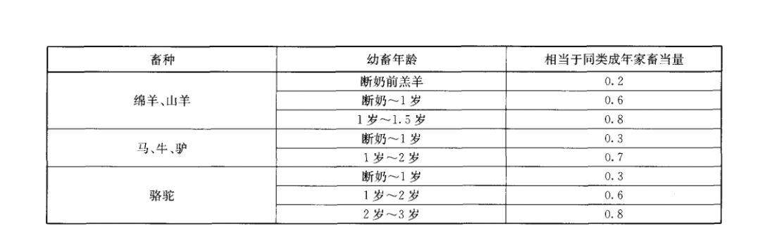 (三)载畜量折算标准参考《内蒙古自治区基本草原保护条例》、原农业部《天然草地合理载畜量的计算》标准(NY/T 635-2015)、原《内蒙古自治区地方标准天然草原适宜载畜量计算标准》制定。原农业部《天然草地合理载畜量的计算》标准(NY/T 635-2015)中仔畜羊单位折算标准为: