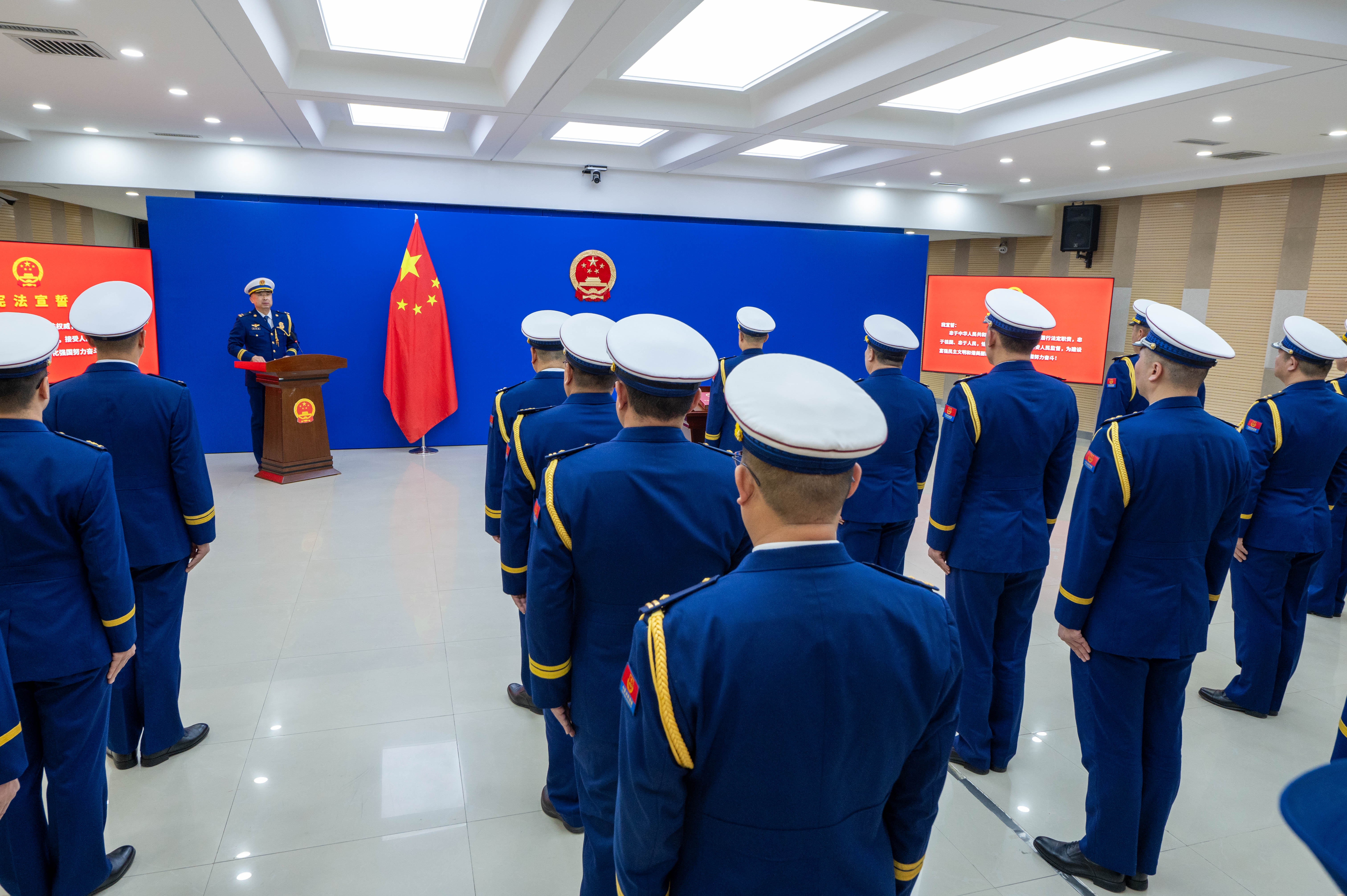 仪式现场庄重肃穆,全体宣誓人员面向国旗、国徽肃立,齐声奏唱中华人民共和国国歌。在王福泉支队长的带领下,领誓人左手抚按宪法、领诵誓词,其他宣誓人齐声跟诵,郑重作出忠于宪法、忠于党和人民的庄严承诺。