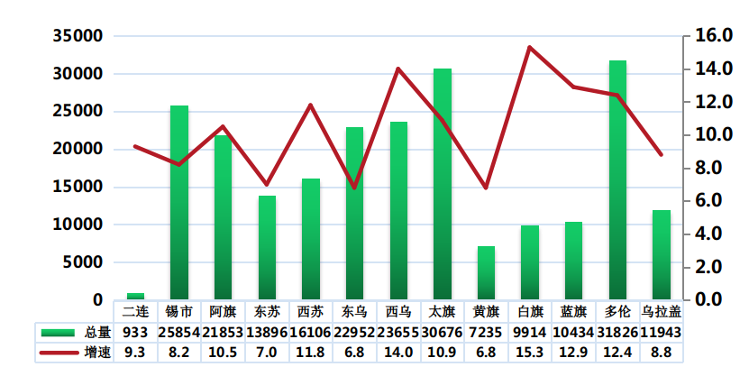 从县域发展看:农林牧渔业产值总量居前六位的地区分别为:多伦(31826万元)、太旗(30676万元)、锡市(25854万元)、西乌旗(23655万元)、东乌旗(22952万元)和阿旗(21853万元),六个地区合计拉动全盟农林牧渔业总产值增长6.4个百分点,贡献率达69%;六个地区农林牧渔业产值增速高于全盟平均水平,分别为:白旗(15.3%)、西乌(14.0%)、蓝旗(12.9%)、多伦(12.4%)、西苏(11.8%)和太旗(10.9%),六个地区合计拉动全盟农林牧渔业总产值增长6.6个百分点,贡献率达63%。
