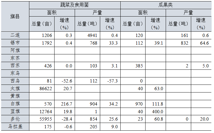 上半年,全盟实现农业产值4402万元,同比下降0.5%。从种植业生产情况看,全盟蔬菜及食用菌生产呈略降,面积及产量均小幅下降。截至6月末,全盟蔬菜及食用菌种植面积10639.33公顷,较上年下降3.0%,产量7952.17吨,下降1.5%。蔬菜主要以根茎类、白菜类和瓜菜类为主,分别占全盟蔬菜及食用菌面积29.5%、23.6%和20.0%。瓜果类生产增势喜人,种植面积112.66公顷,增长43.3%,产量187.80吨,增长7.3%,主要以西瓜和香瓜为主,占全盟瓜果类面积78.1%和20.9%。