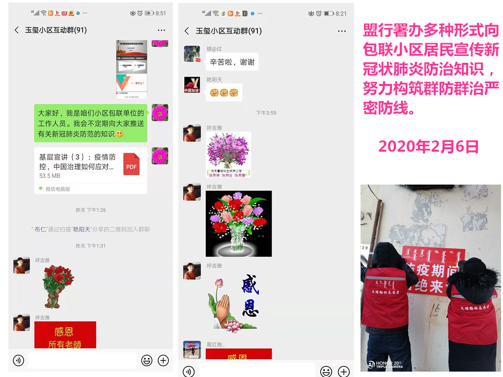 行署办迅速对接包联社区,对各分包小区基本情况及疫情防控存在的困难和问题进行详细排查,制发了《锡林郭勒盟行政公署办公室关于深入包联小区开展新型冠状病毒感染肺炎防控工作的通知》,全面铺开预防管控工作。对包联小区实行全封闭、严防控,组织党员干部深入包联小区开展24小时无缝对接摸排动态管理,由行署办主要领导总带班,各处级干部带班值守。同时,招募志愿者加入到疫情防控工作中,发挥合力优势,做到全覆盖、无死角、零遗漏,保障疫情防控工作顺利开展。