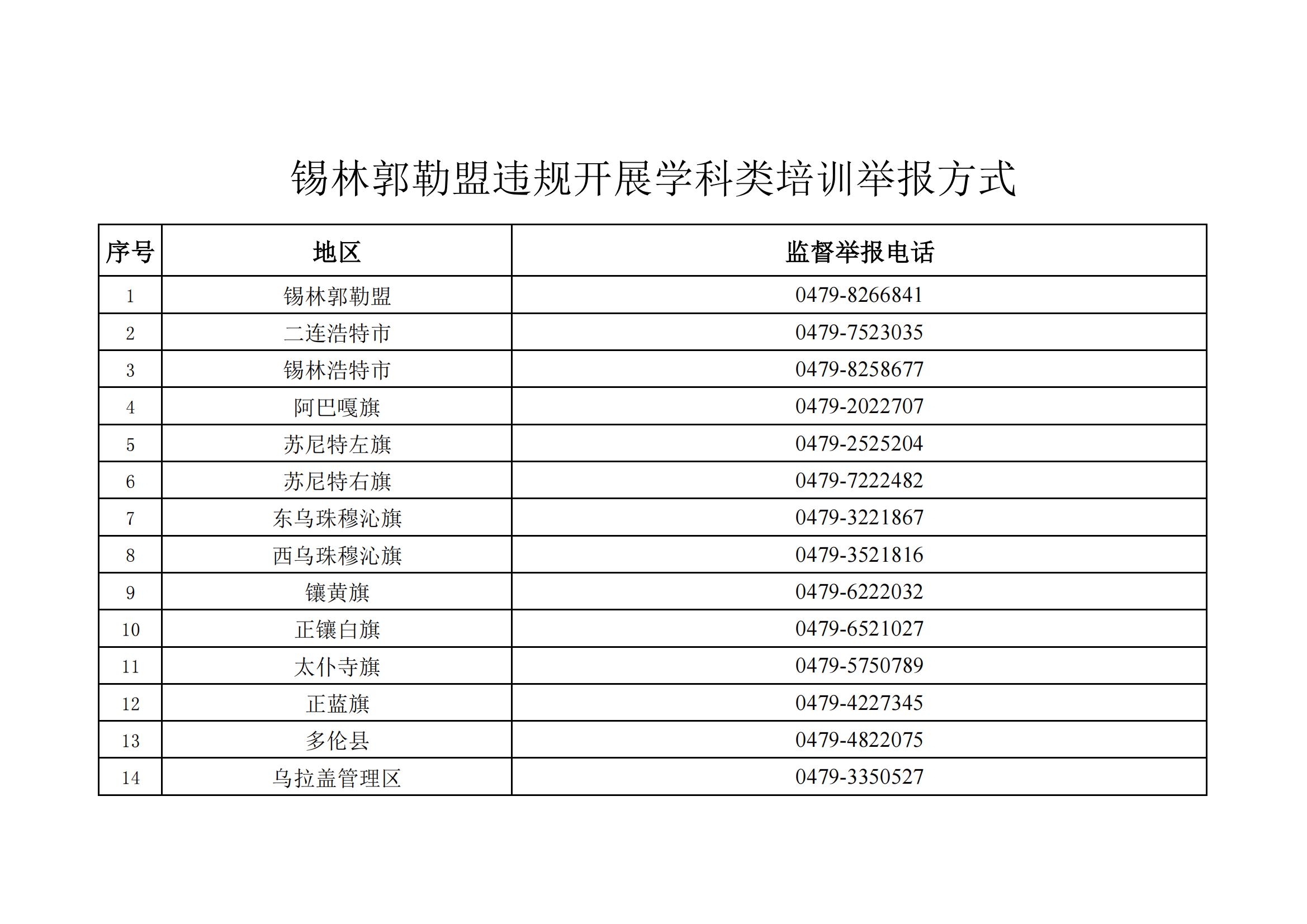 锡林郭勒盟违规开展学科类培训举报电话: