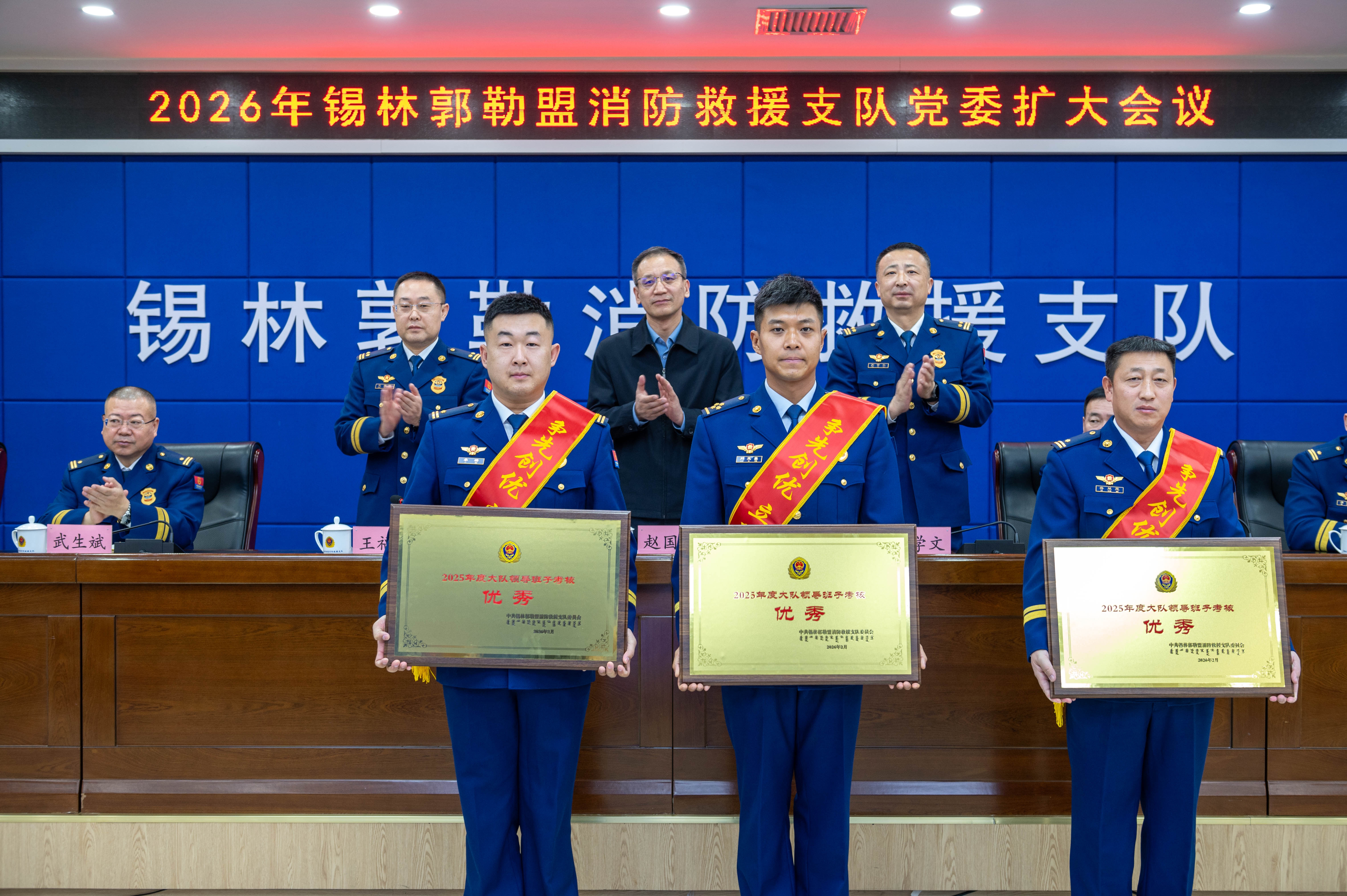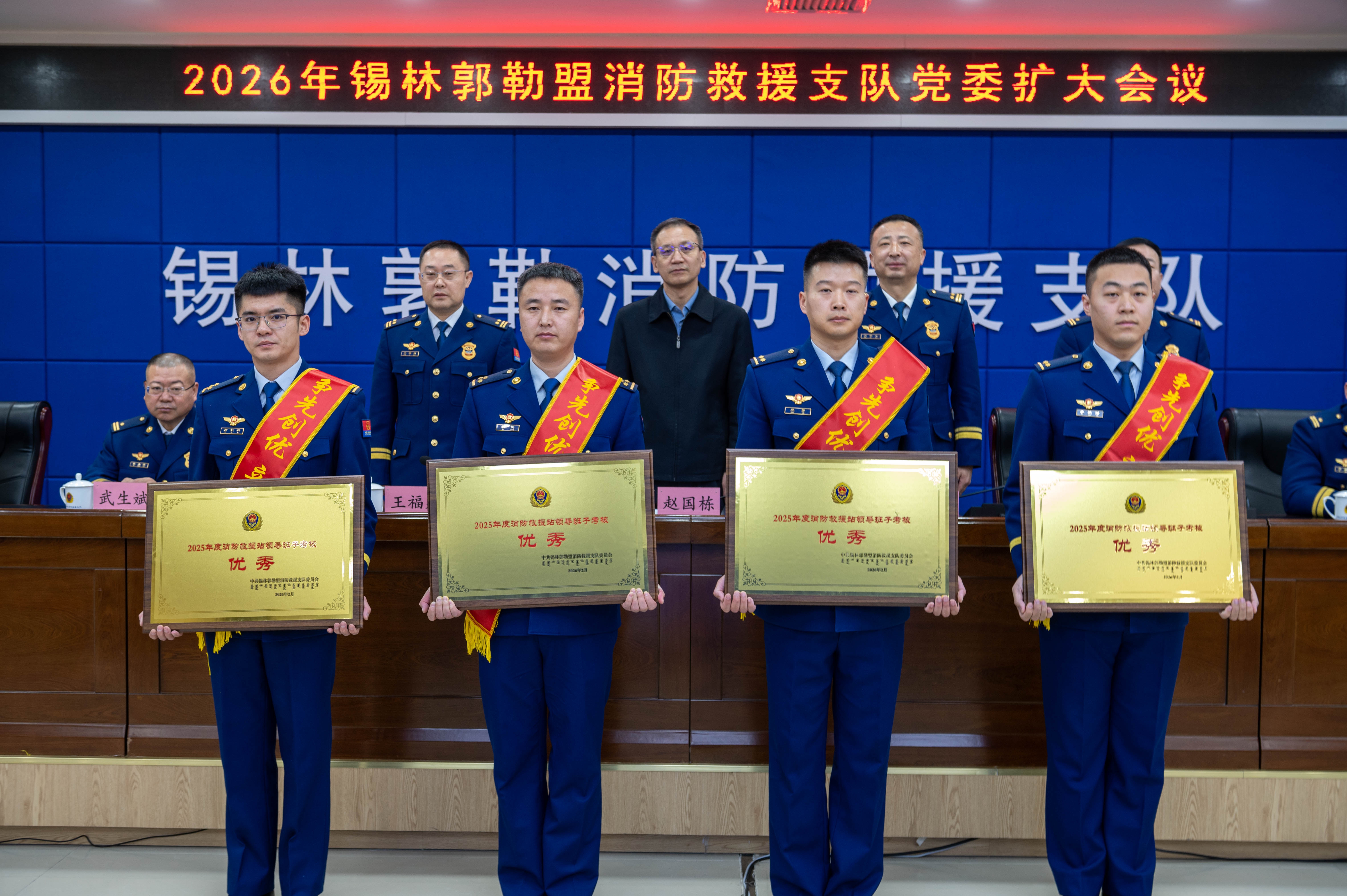 期间,与会领导为获评2025年大队、消防站领导班子考核“优秀”等次的集体和立功指战员代表颁奖。会后组织参会人员围绕党委工作报告和年度工作要点进行分组讨论。