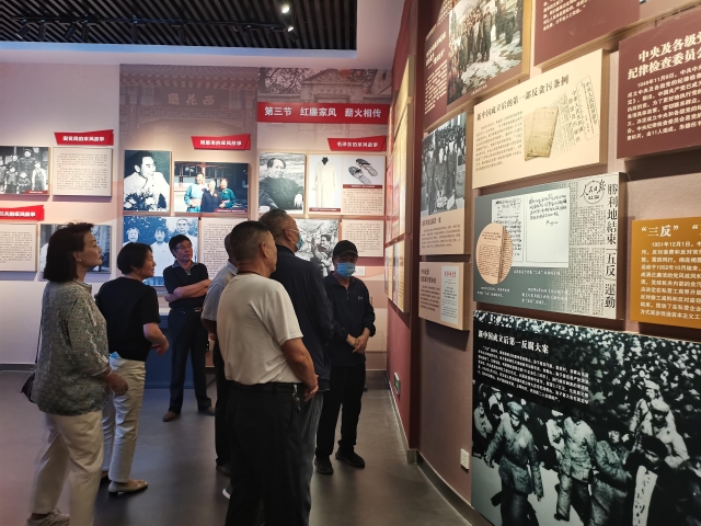 在解说员的引导下,老同志们首先来到盟廉政文化展厅,在展陈丰富、形式多样的展馆内,沉浸式接受廉政文化教育。在“清风廉韵、润泽古今”展厅,大家感受古代先贤对“廉”的认识,追溯廉洁文化的起源和历史;在“红色血脉、初心永恒”展厅,全面回顾中国共产党从成立初期便一以贯之的全面从严治党的光辉历程;在“从严治党、永葆生机”展厅,重温重读党和国家领导人关于全面从严治党的重要论述;在“以案为鉴、自我革命”展厅,集中观看近年来发生在身边的典型贪腐案件和警示教育片,全面了解中央部署、内蒙古自治区行动、锡林郭勒盟践行的反腐成果;在“凝心聚力、时代强音”展厅,共同体味习近平总书记“我将无我,不负人民”的奉献担当,进一步扣响了初心使命,汲取信仰力量。