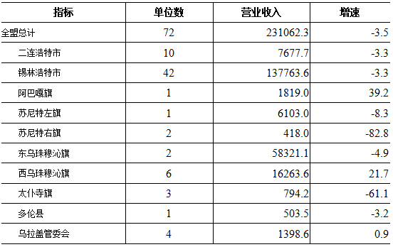 有规上服务业企业的10个地区中,仅3个地区规上服务业营业收入呈正增长,其中:阿旗规上服务业营业收入同比增长39.2%,西乌旗同比增长21.7%,乌拉盖同比增长0.9%。黄旗、白旗和蓝旗无规上服务业企业。