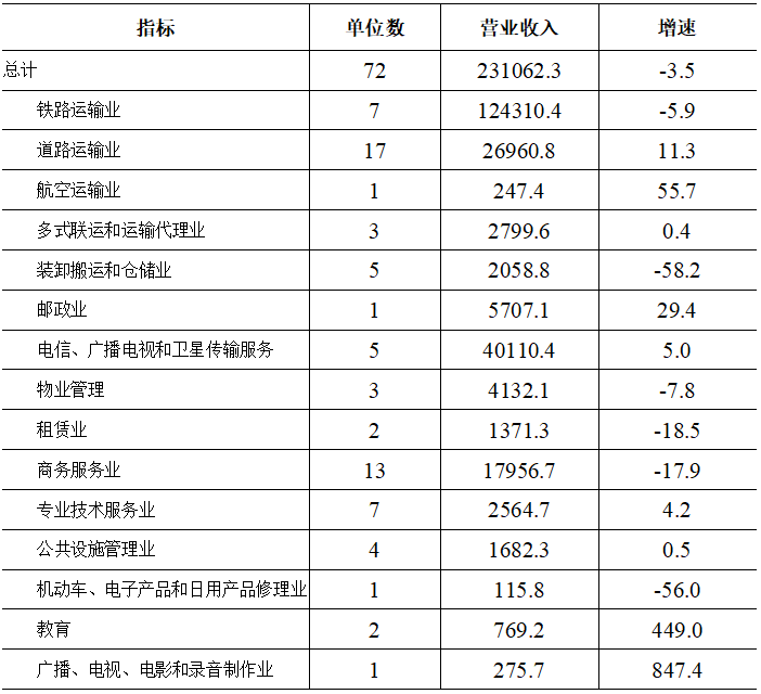 受铁路运输业及装卸搬运和仓储业下降影响,我盟交通运输、仓储和邮政业营业收入同比下降3.9%,下拉全盟规上服务业营业收入2.7个百分点;电信、广播电视和卫星传输服务营业收入同比增长5.0%,拉动全盟收入增长0.8个百分点;物业管理3家企业营业收入同比下降7.8%,下拉全盟0.15个百分点。租赁和商务服务业营业收入同比下降17.9%,下拉全盟规上服务业营业收入1.8个百分点,主要受劳务派遣企业影响,全盟劳务派遣企业共8家,其中6家营业收入较同期出现大幅下滑,较同期共减少近5000万元。劳务派遣业由于招投标流程繁琐,当季的部分合同基本要在下季度才能签订,因此营业收入出现大幅下滑。居民修理业营业收入同比下降56.0%,该行业的代表企业仅1家,主营业务活动为中小型工程车的售后修理和维护,去年受疫情影响业务量锐减,企业面临注销或停产。专业技术服务业受众鑫安国土技术有限公司和乾图交通设计有限公司影响,同比增长4.2%;教育业受未来城博苑幼儿园和福达驾驶员培训公司今年业务恢复影响,同比增长4.5倍,拉动全盟收入增长0.26个百分点;文化娱乐业受电影院恢复营业影响,营业收入同比增长8.5倍,拉动全盟收入增长0.1个百分点。