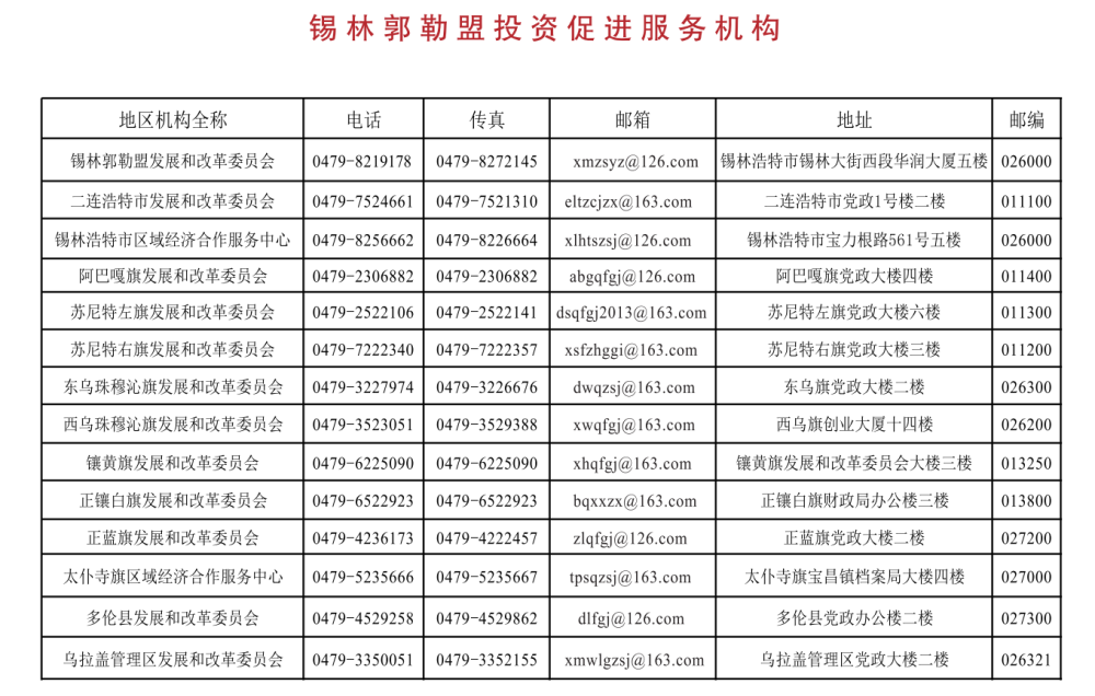 锡林郭勒盟投资促进服务机构联络表