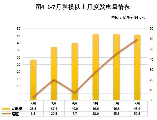 1-7月,规模以上发电量合计2897.17亿千瓦时,同比增长25.1%,较上月增幅扩大4.9个百分点;7月当月生产电力45.91亿千瓦时,同比增长59.5%,较6月扩大14个百分点。