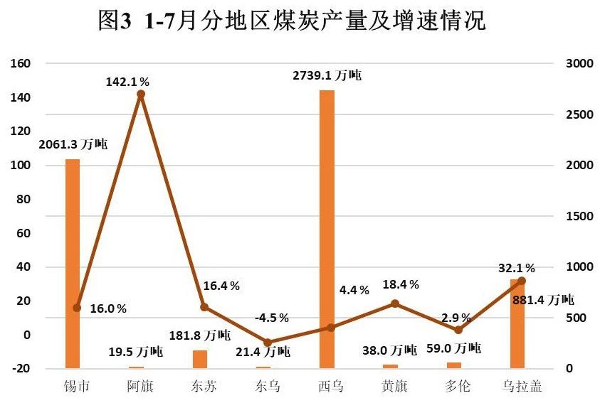1-7月,规模以上工业生产原煤6001.56万吨,同比增长12.3%,增幅较上半年提升4个百分点。其中无烟煤38.01万吨,同比增长18.4%;一般烟煤19.46万吨,同比1.42倍;褐煤5944.09万吨,同比增长12.1%。7月当月生产原煤849.7万吨,同比增长45.0%。