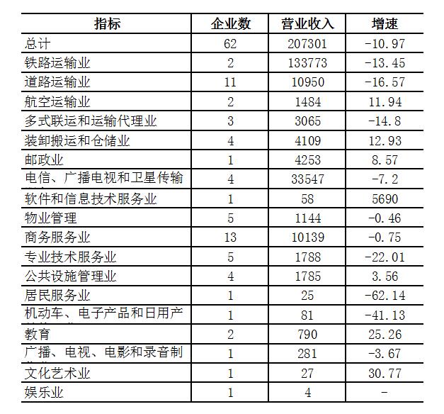 截至4月末,全盟规模以上服务业涉及18个行业62户企业。其中道路运输业和商务服务业各24户,专业技术服务业5户,物业管理业5户,装卸搬运和仓储业4户,广播电视和卫星传输服务业4户,多式联运和运输代理业3户,铁路运输业、航空运输业和教育各2户。另外还有7个行业均只有1户企业,依次是邮政业、软件和信息技术服务业、居民服务业、机动车修理业、广播电视电影录音制作业、文化艺术业和娱乐业。虽然这些行业部分企业经营状况良好,发展较为稳定,但是单位数量较少,产业聚集性较低,对全盟规上服务业经济发展水平带动作用不够明显。