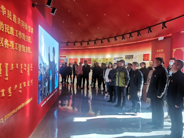 活动中,党员干部在讲解员的带领下参观了教育基地“举旗定向 思想领航”“守望相助 手足相亲”“纲举目张 同心筑梦”三个单元,大家认真聆听、驻足观看,重温习近平总书记参加宝力根苏木冬季那达慕时暖心话语,深刻感悟习近平总书记关于加强和改进民族工作的重要思想的丰富内涵,详细了解民族团结进步教育事业的发展历程,深刻领会了以铸牢中华民族共同体意识为主线推进新时代党的民族工作高质量发展的重要意义。
