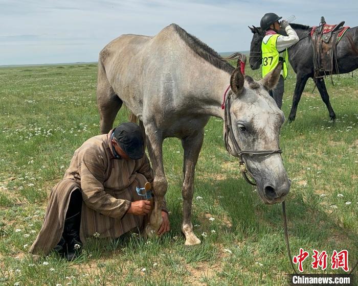 图为参赛的蒙古马骨折,牧民把腰带撕成条来固定伤处。奥蓝 摄