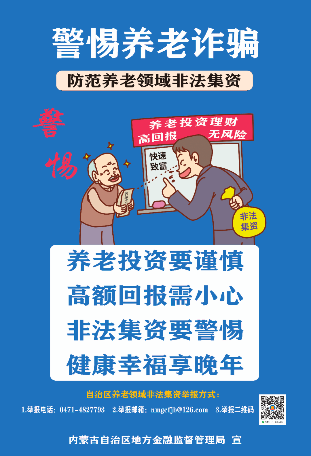 被骗老人通常在遭受财产损失的同时,更承受着巨大的心理压力,严重影响晚年生活质量。广大老年朋友们要增强防范养老领域非法集资的意识和识别能力,自觉远离、抵制、揭露非法集资。