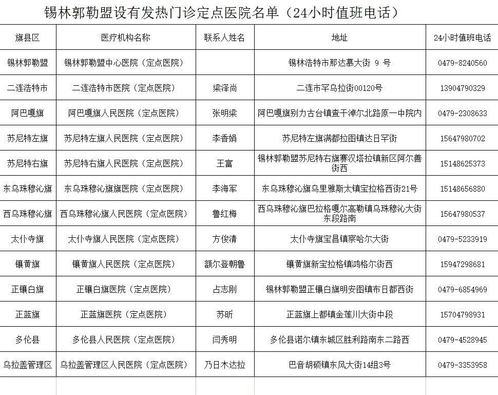 锡林郭勒盟设有发热门诊的定点医院名单,附24小时值班电话_锡林郭勒盟行政公署