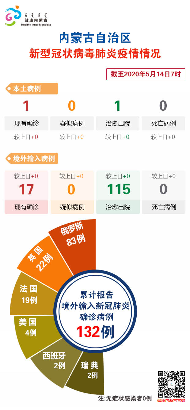 截至2020年5月14日7时,内蒙古自治区累计报告本土确诊病例2例,治愈出院1例;境外输入确诊病例132例(俄罗斯83例、英国22例、法国19例、美国4例、西班牙2例、瑞典2例),治愈出院115例。现有本土确诊病例1例,境外输入确诊病例17例。