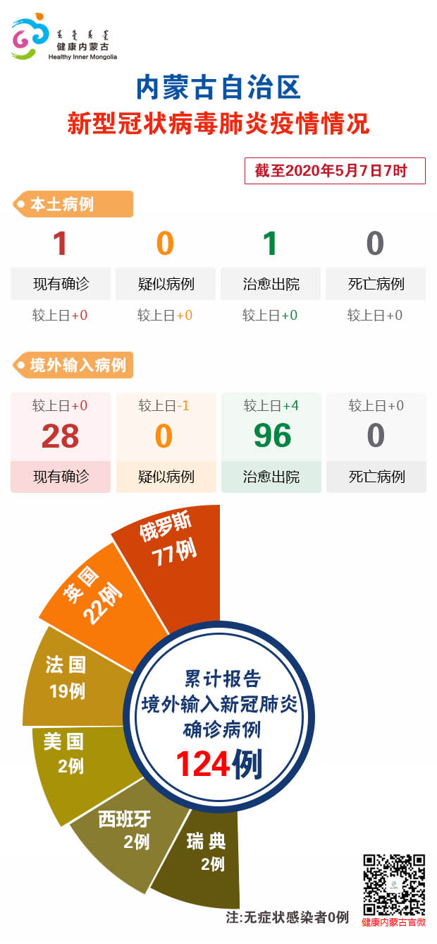 截至2020年5月7日7时,内蒙古自治区累计报告输入本土确诊病例2例,治愈出院1例;境外输入确诊病例124例(俄罗斯77例、英国22例、法国19例、美国2例、西班牙2例、瑞典2例),治愈出院96例。现有输入本土确诊病例1例,境外输入确诊病例28例。