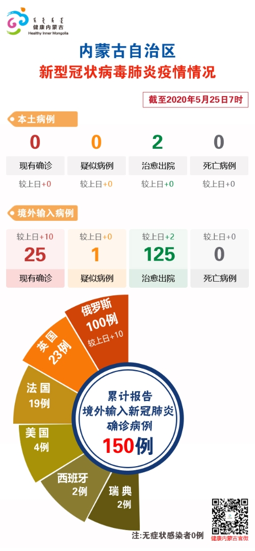 截至2020年5月25日7时,内蒙古自治区累计报告输入本土确诊病例2例,治愈出院2例;境外输入确诊病例150例(俄罗斯100例、英国23例、法国19例、美国4例、西班牙2例、瑞典2例),治愈出院125例。现有境外输入确诊病例25例、疑似病例1例。