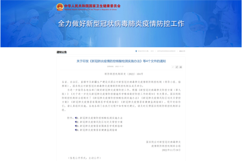 为进一步指导各地各部门做好新冠肺炎疫情防控工作,根据《新型冠状病毒肺炎防控方案(第九版)》《关于进一步优化新冠肺炎疫情防控措施科学精准做好防控工作的通知》有关要求,国务院联防联控机制综合组制定了《新冠肺炎疫情防控核酸检测实施办法》《新冠肺炎疫情风险区划定及管控方案》《新冠肺炎疫情居家隔离医学观察指南》《新冠肺炎疫情居家健康监测指南》。现印发给你们,请认真组织实施。各地各部门在执行过程中如有相关建议,请及时反馈国务院联防联控机制综合组。