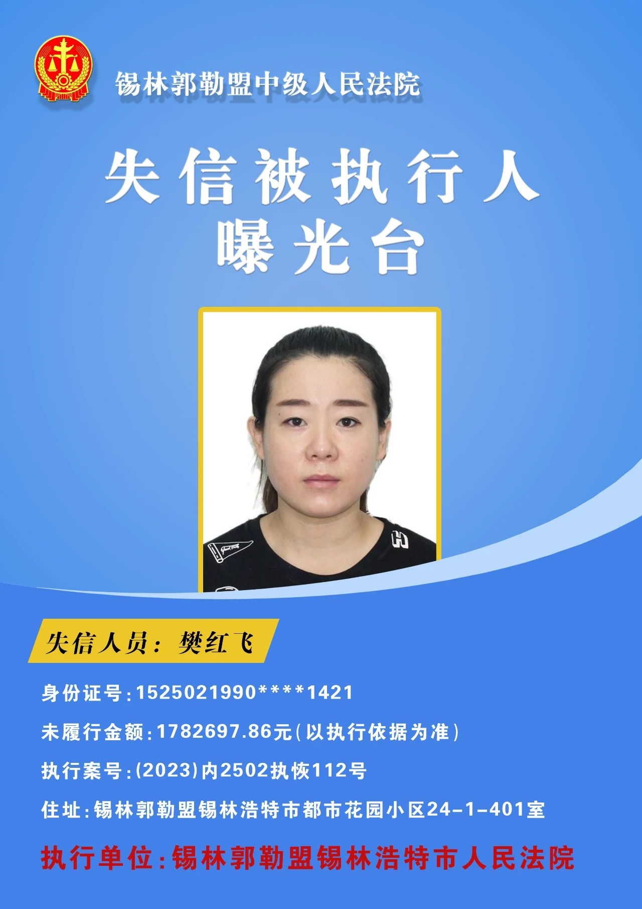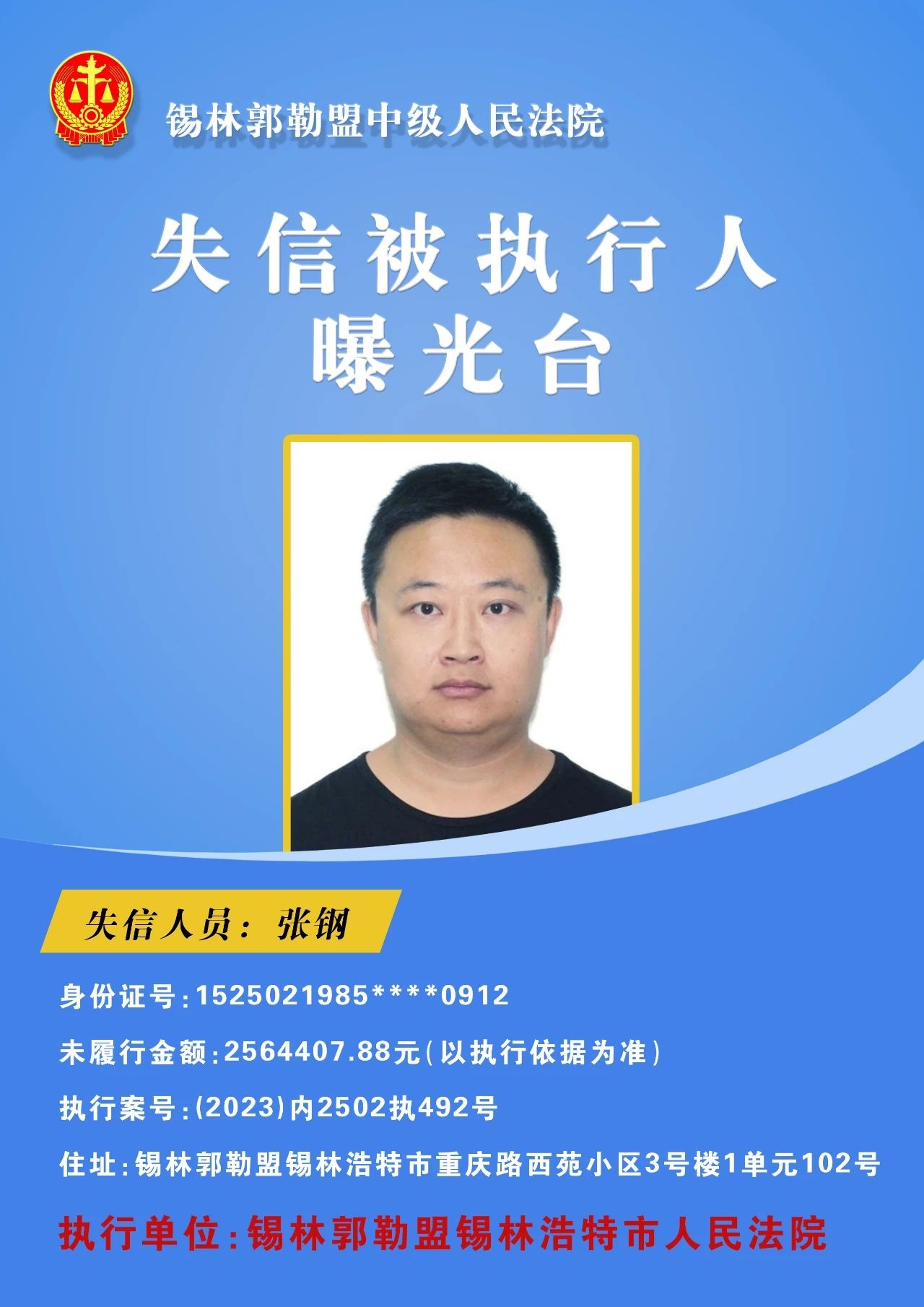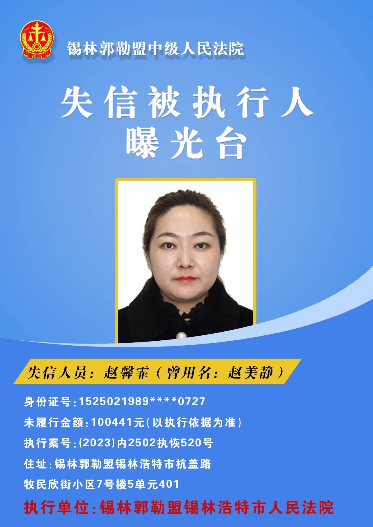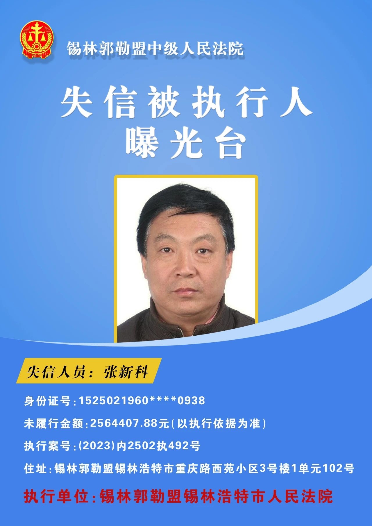 为切实保障申请执行人的合法权益,促使被执行人自觉履行生效法律文书确定的义务,推进社会信用体系建设,维护司法权威,根据 《最高人民法院关于公布失信被执行人名单信息的若干规定》的相关规定,经依法审查,现锡林郭勒盟中级人民法院将下列失信被执行人名单予以公布,希望社会各界予以监督,如有发现失信被执行人线索,请及时举报。