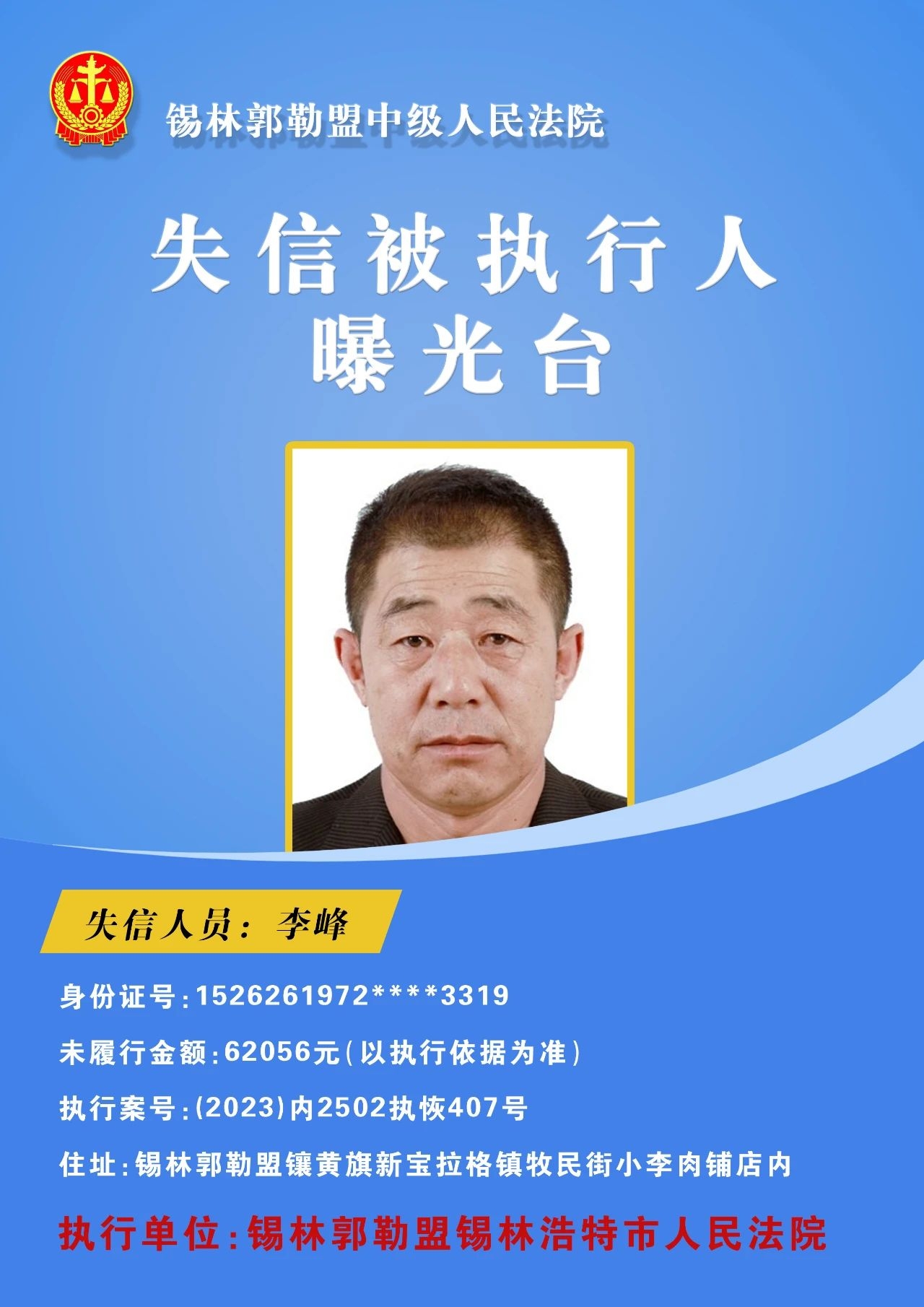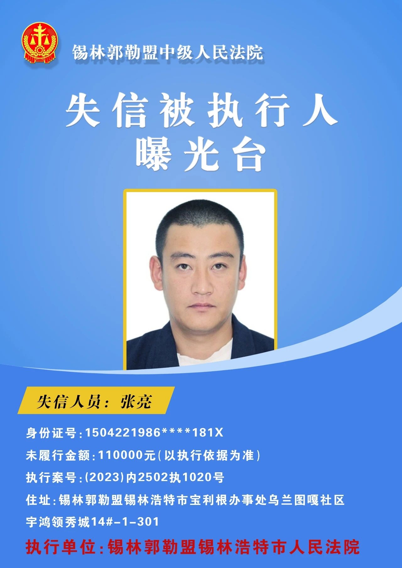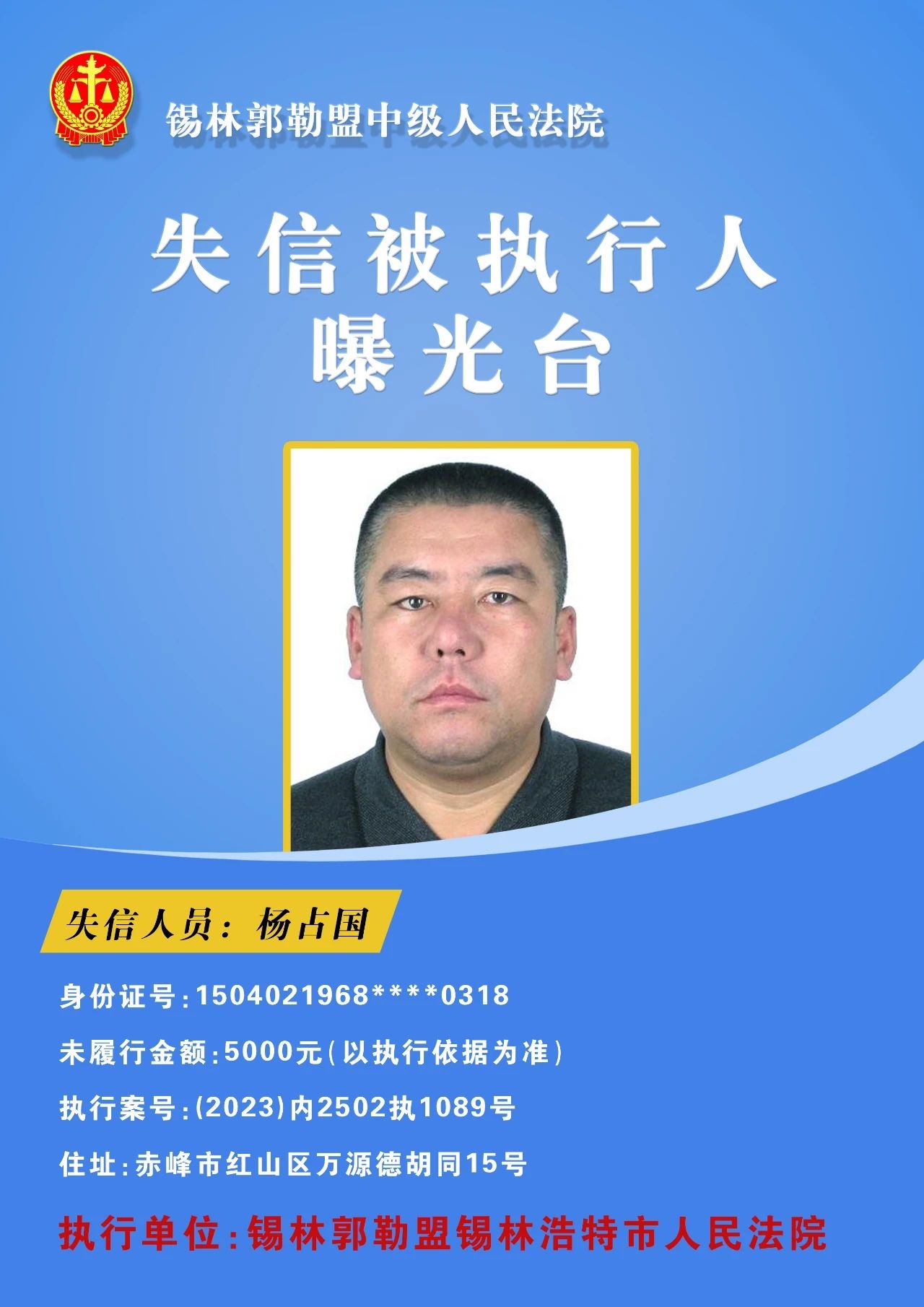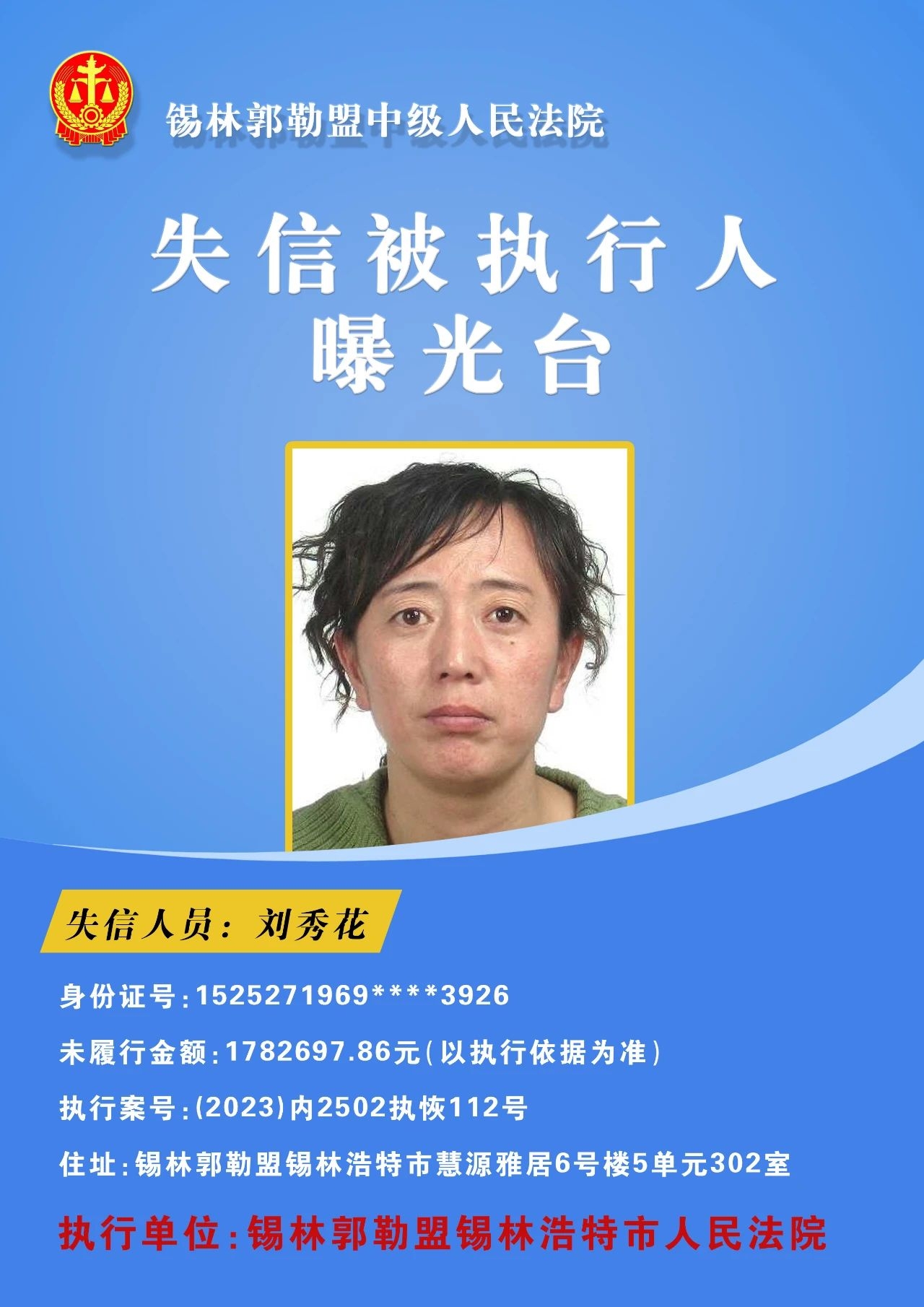 为切实保障申请执行人的合法权益,促使被执行人自觉履行生效法律文书确定的义务,推进社会信用体系建设,维护司法权威,根据 《最高人民法院关于公布失信被执行人名单信息的若干规定》的相关规定,经依法审查,现锡林郭勒盟中级人民法院将下列失信被执行人名单予以公布,希望社会各界予以监督,如有发现失信被执行人线索,请及时举报。