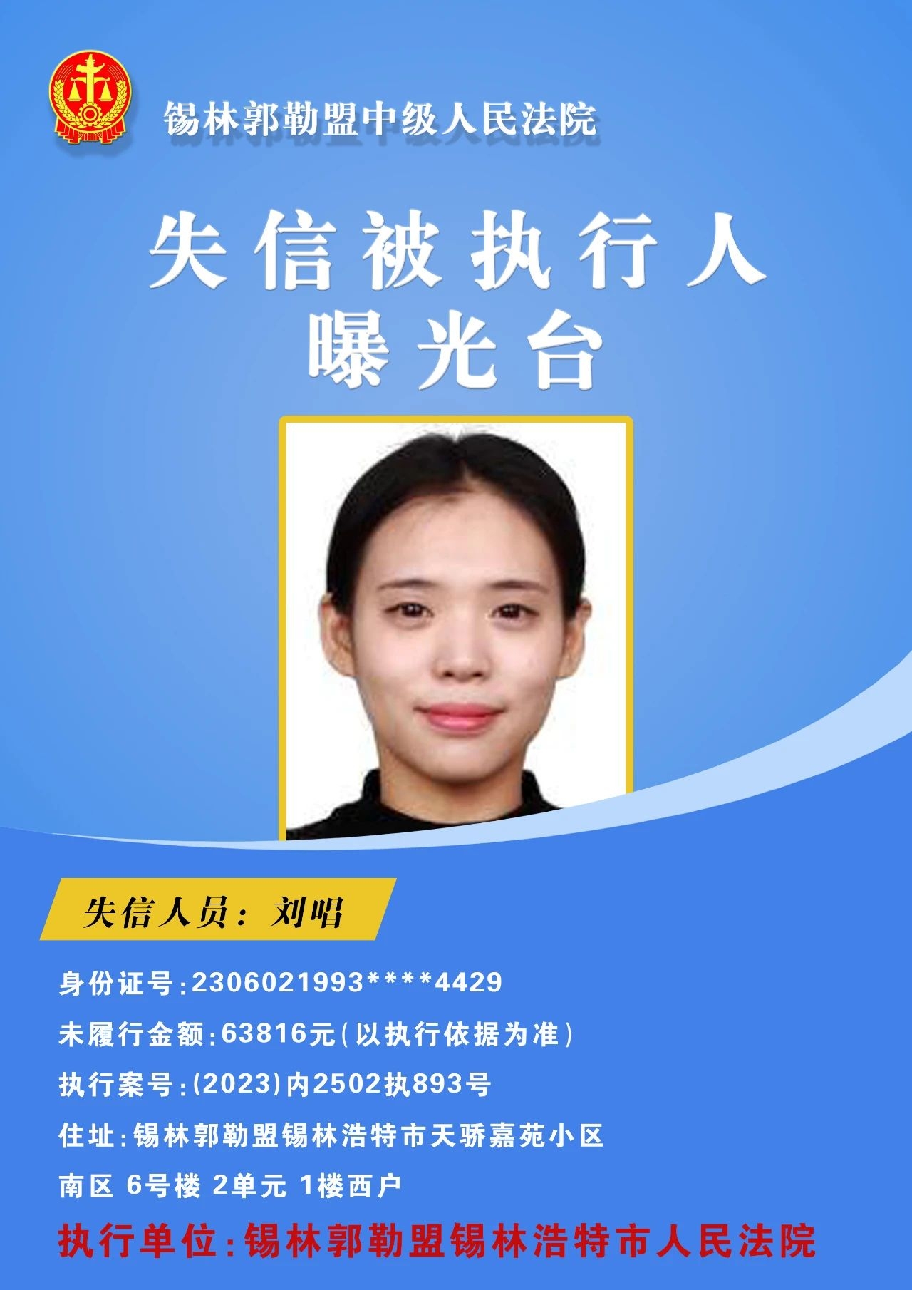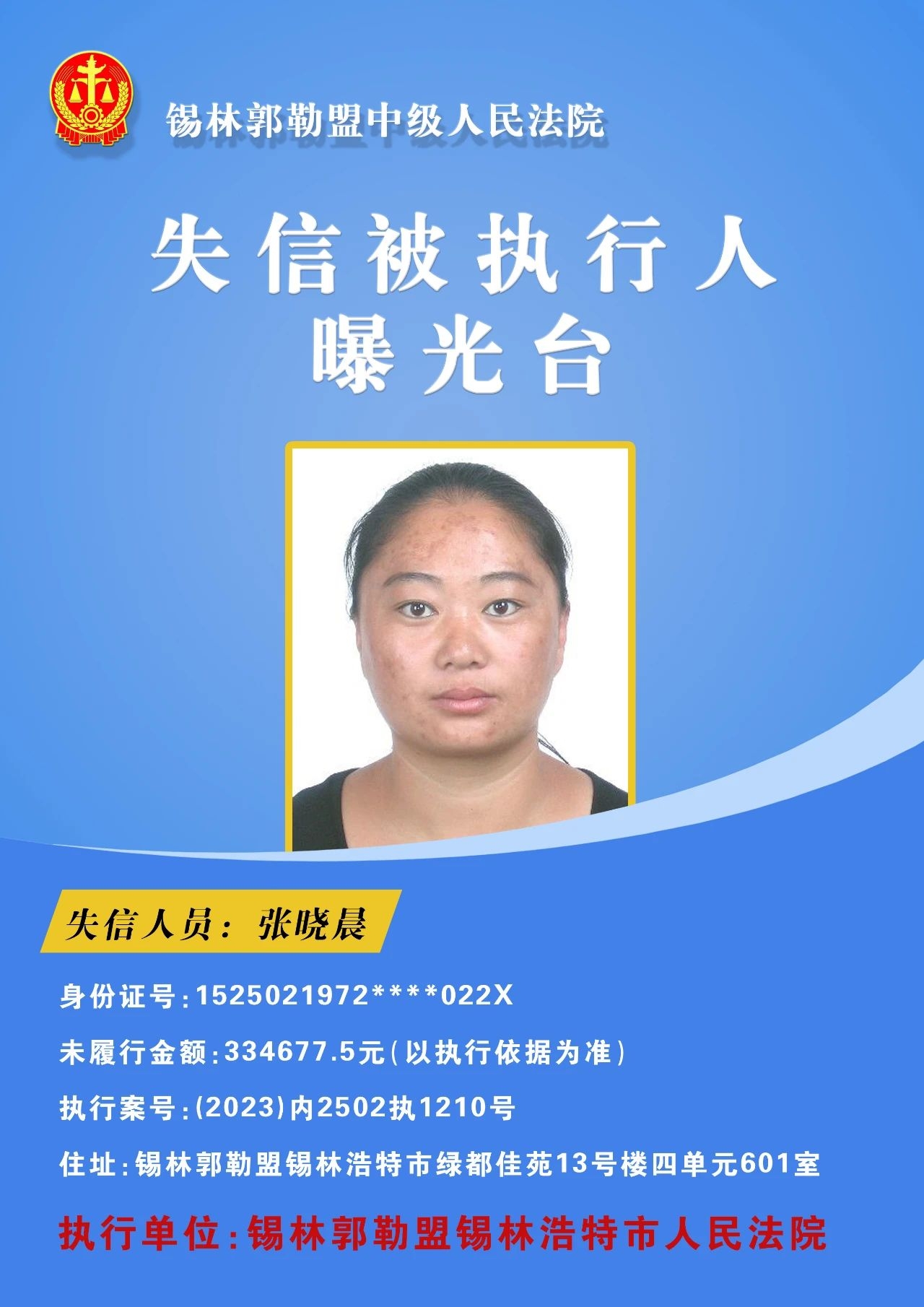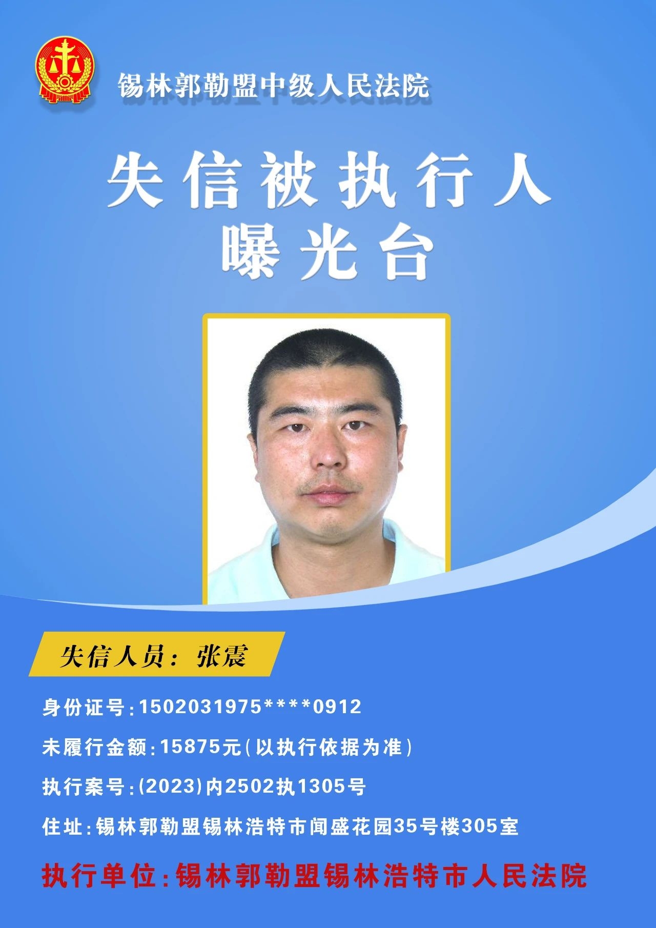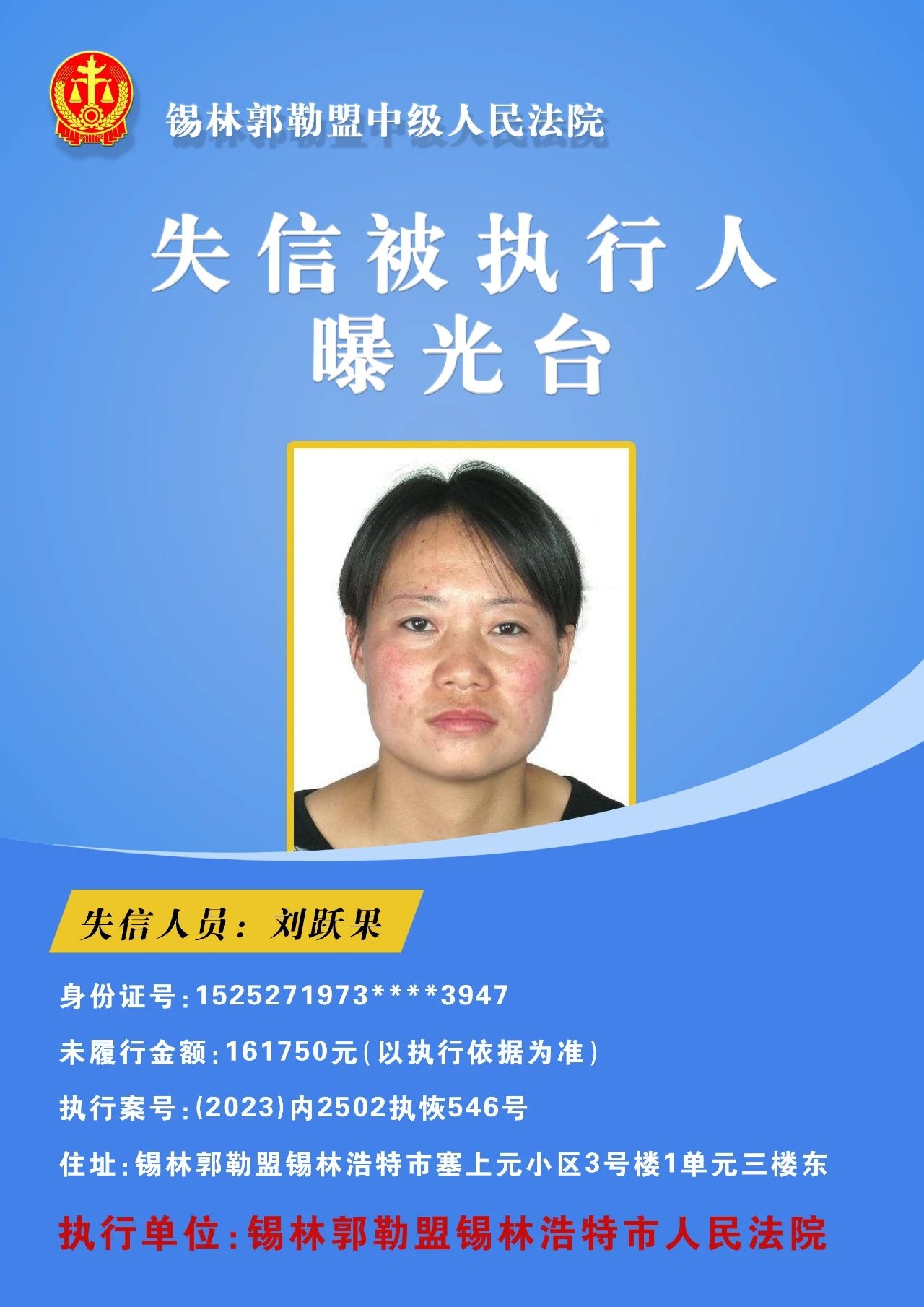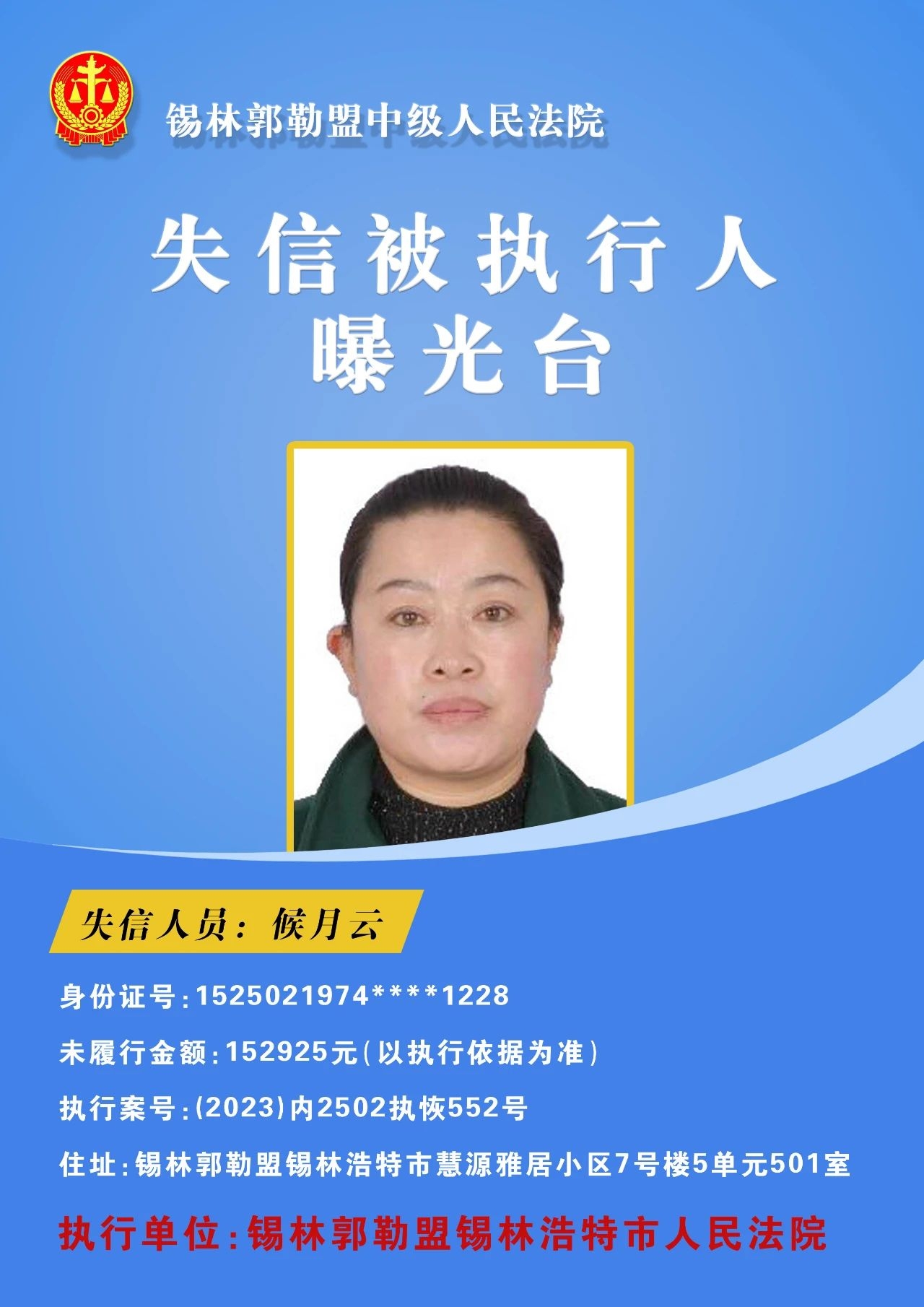 为切实保障申请执行人的合法权益,促使被执行人自觉履行生效法律文书确定的义务,推进社会信用体系建设,维护司法权威,根据 《最高人民法院关于公布失信被执行人名单信息的若干规定》的相关规定,经依法审查,现锡林郭勒盟中级人民法院将下列失信被执行人名单予以公布,希望社会各界予以监督,如有发现失信被执行人线索,请及时举报。