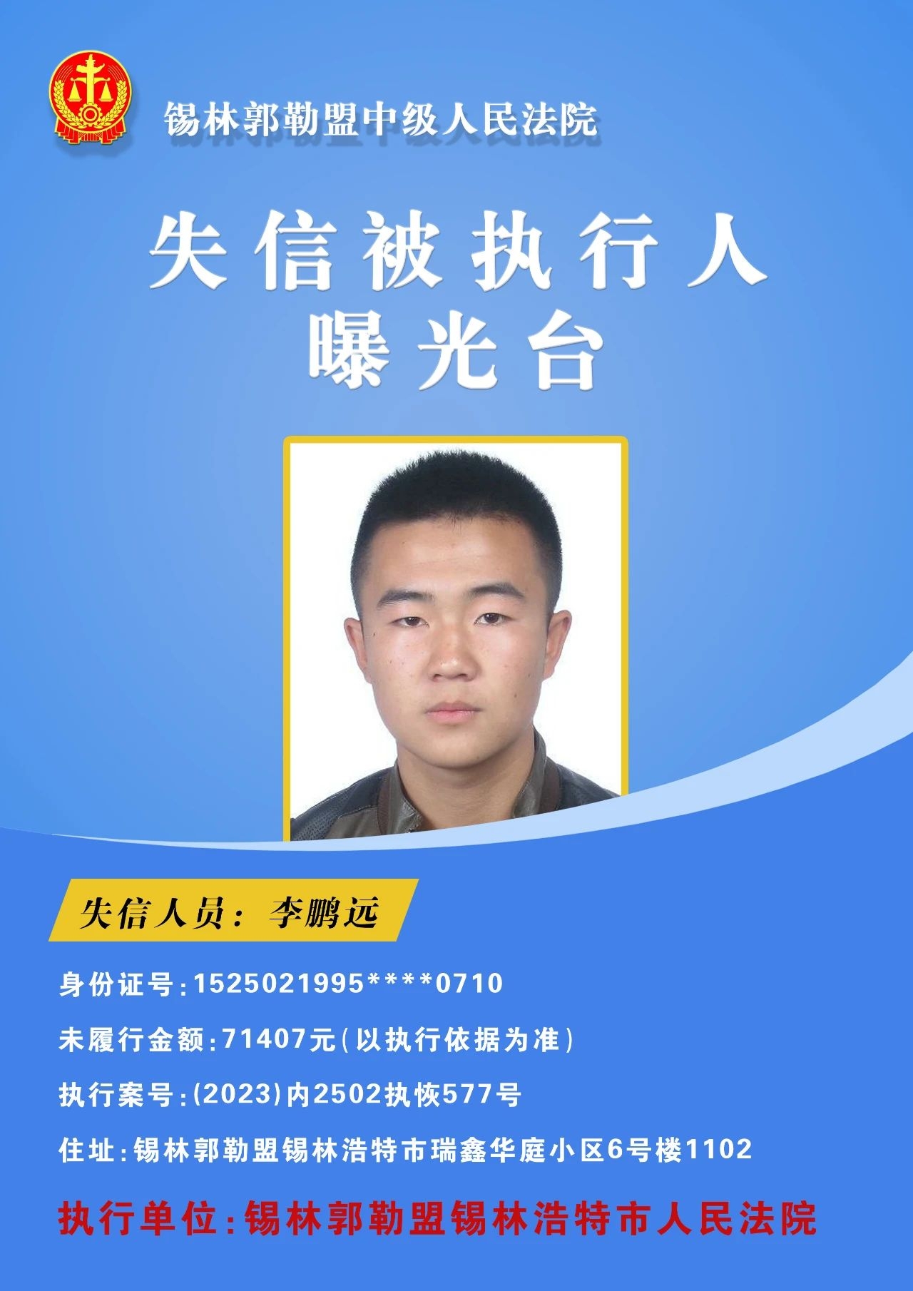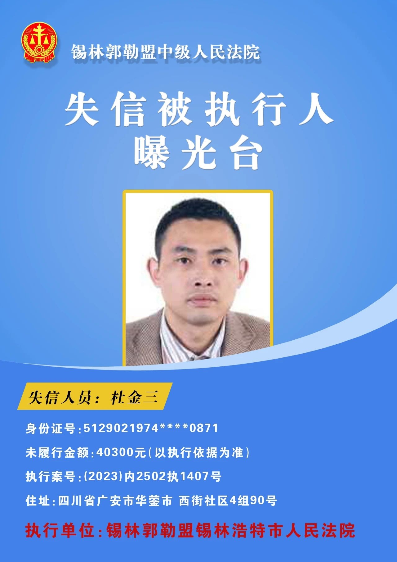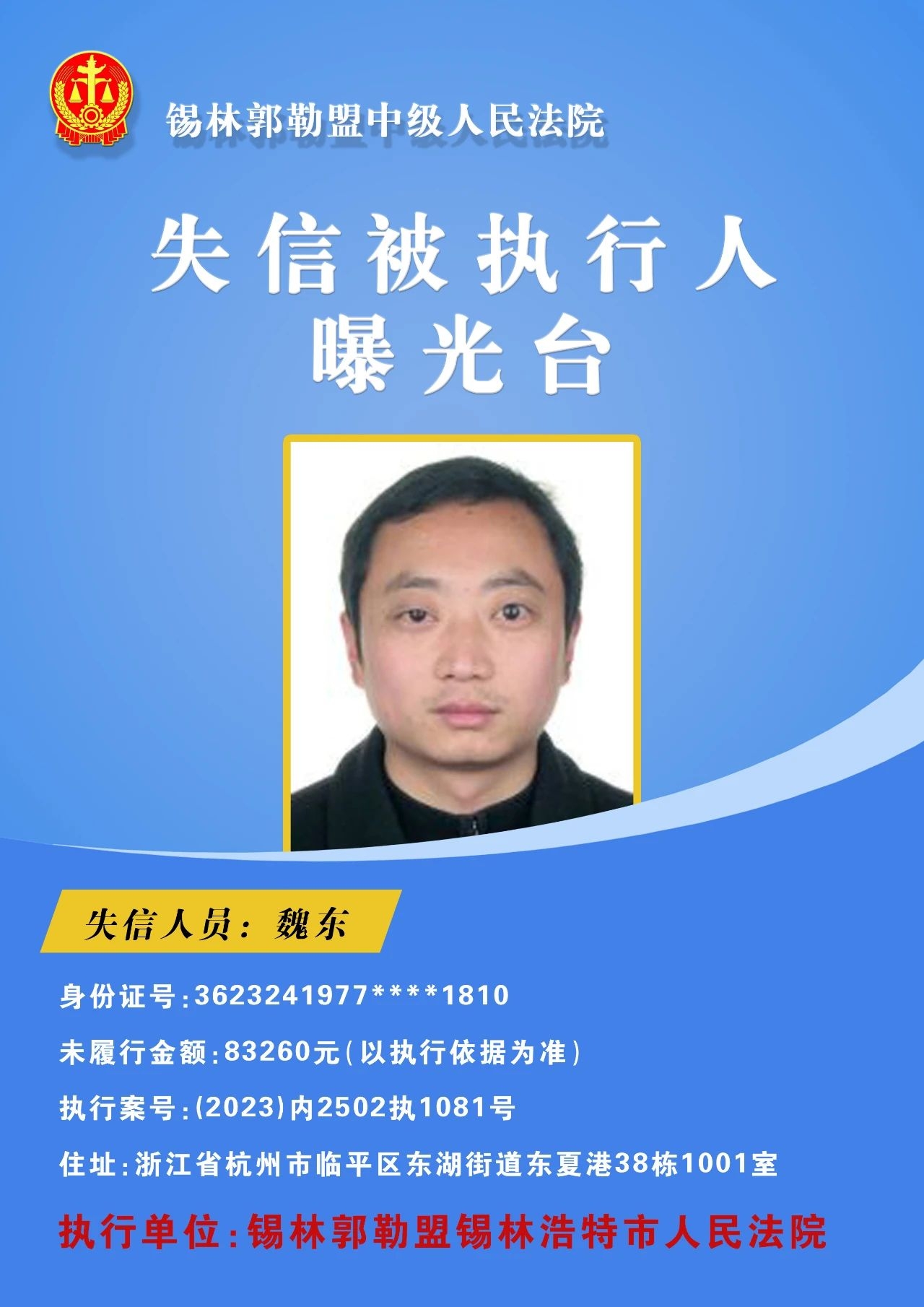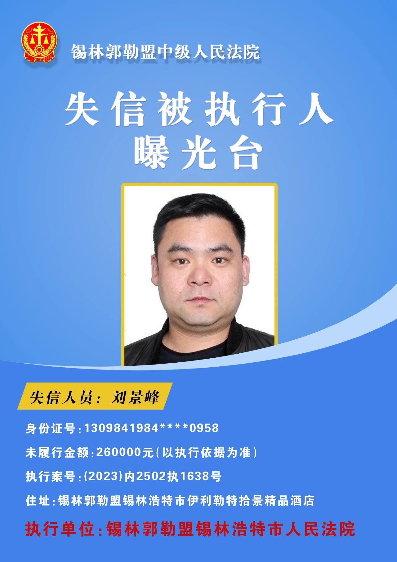 为切实保障申请执行人的合法权益,促使被执行人自觉履行生效法律文书确定的义务,推进社会信用体系建设,维护司法权威,根据 《最高人民法院关于公布失信被执行人名单信息的若干规定》的相关规定,经依法审查,现锡林郭勒盟中级人民法院将下列失信被执行人名单予以公布,希望社会各界予以监督,如有发现失信被执行人线索,请及时举报。