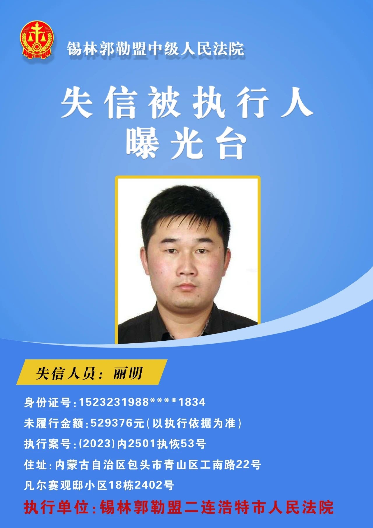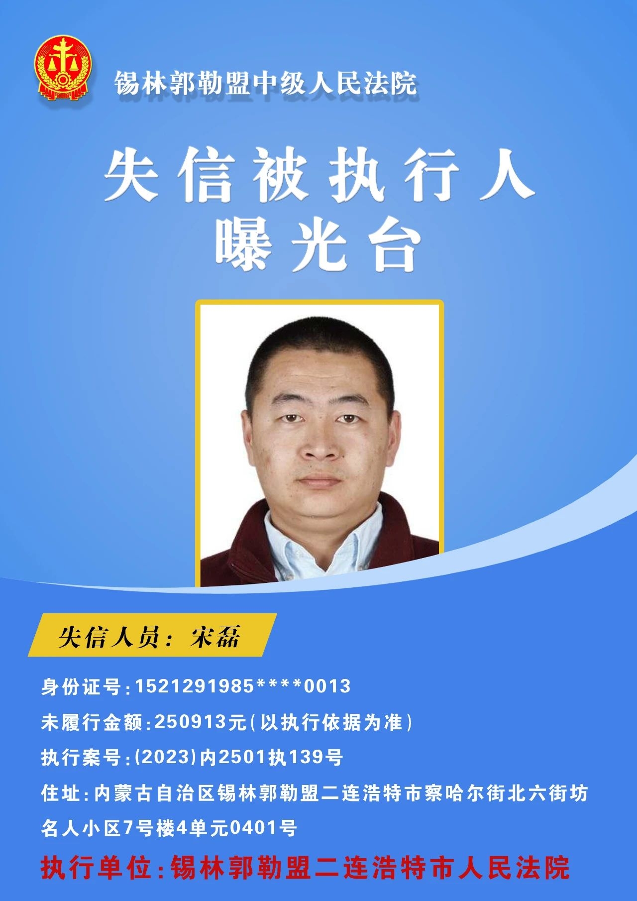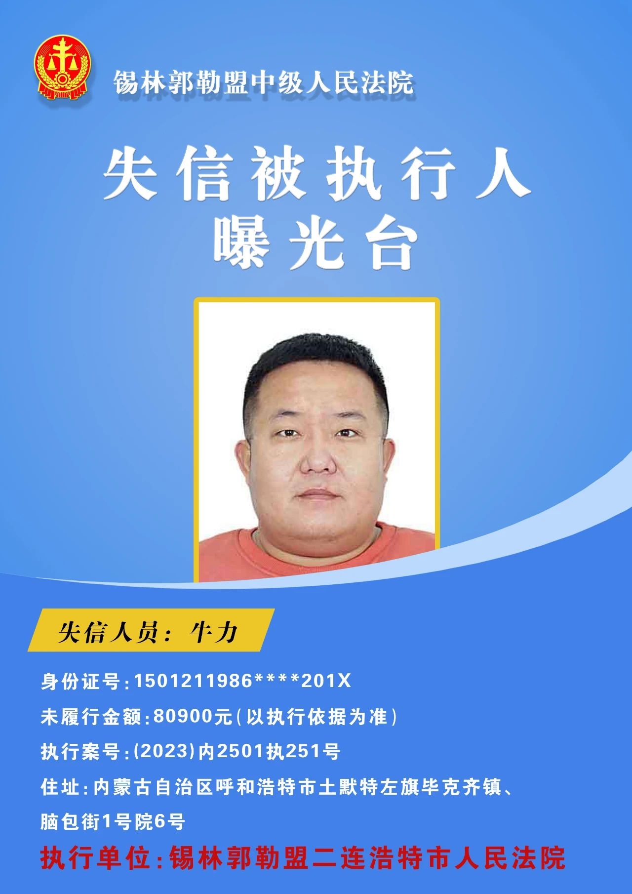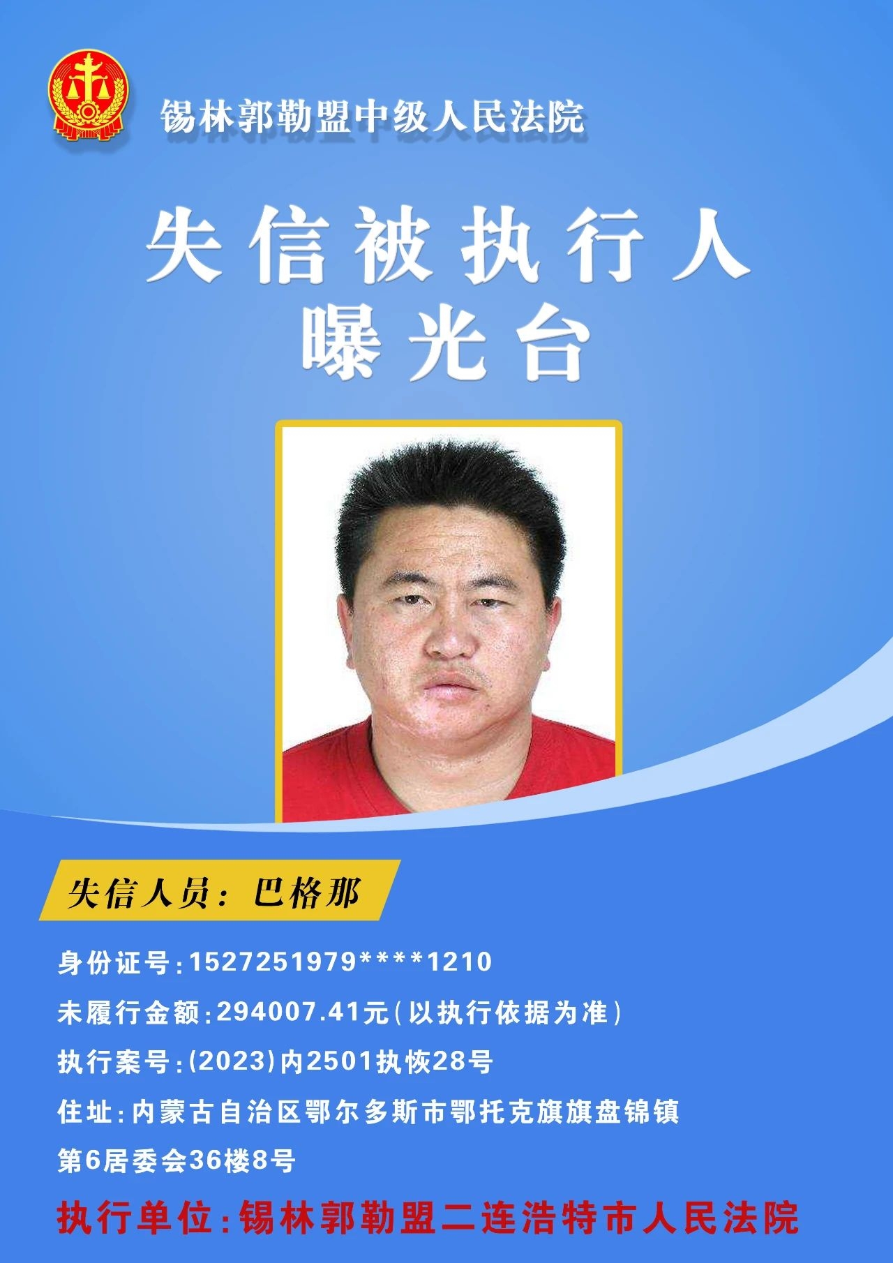 为切实保障申请执行人的合法权益,促使被执行人自觉履行生效法律文书确定的义务,推进社会信用体系建设,维护司法权威,根据 《最高人民法院关于公布失信被执行人名单信息的若干规定》的相关规定,经依法审查,现锡林郭勒盟中级人民法院将下列失信被执行人名单予以公布,希望社会各界予以监督,如有发现失信被执行人线索,请及时举报。