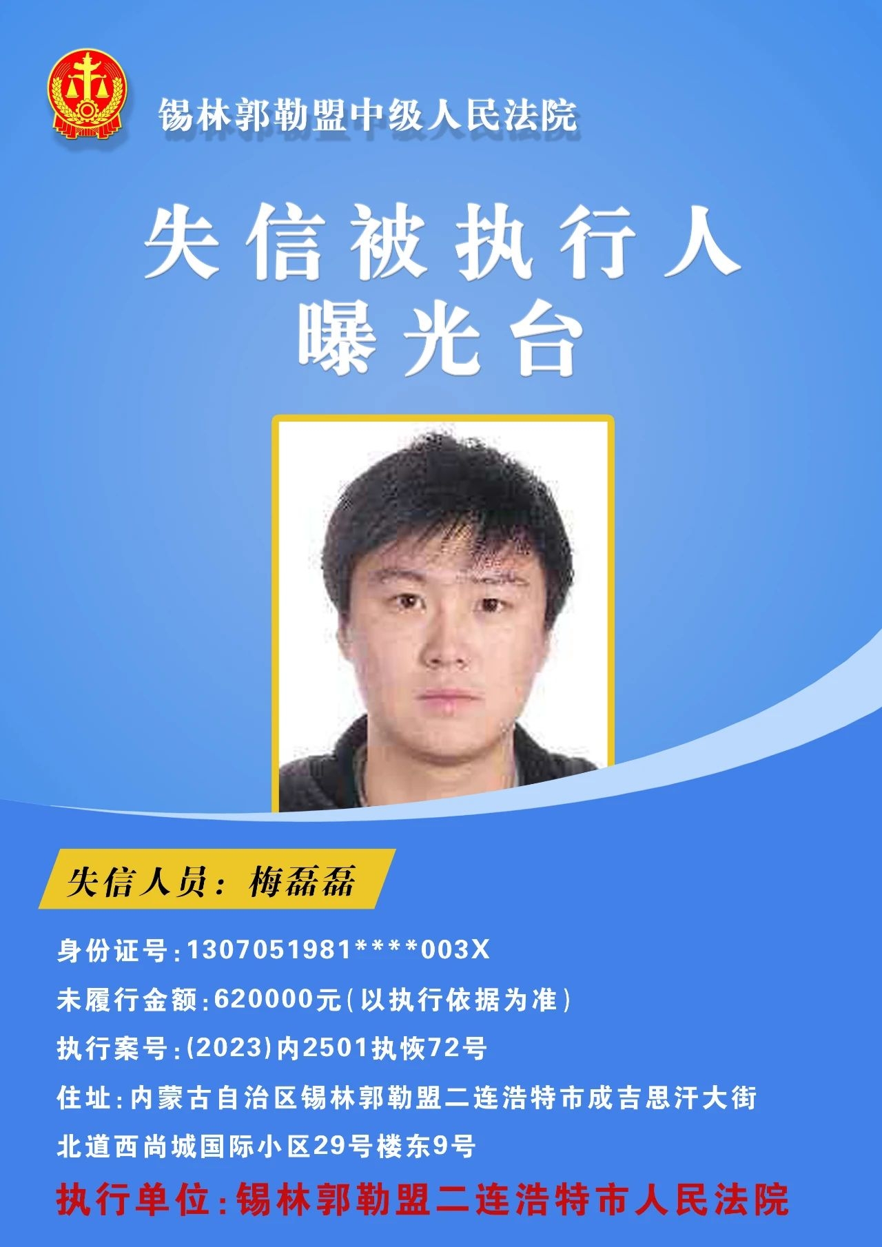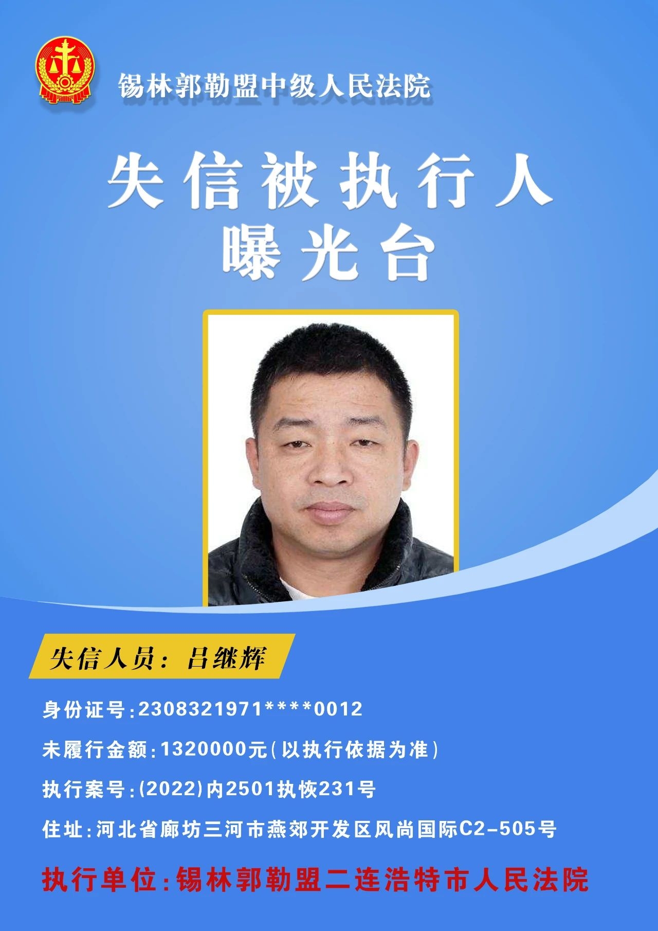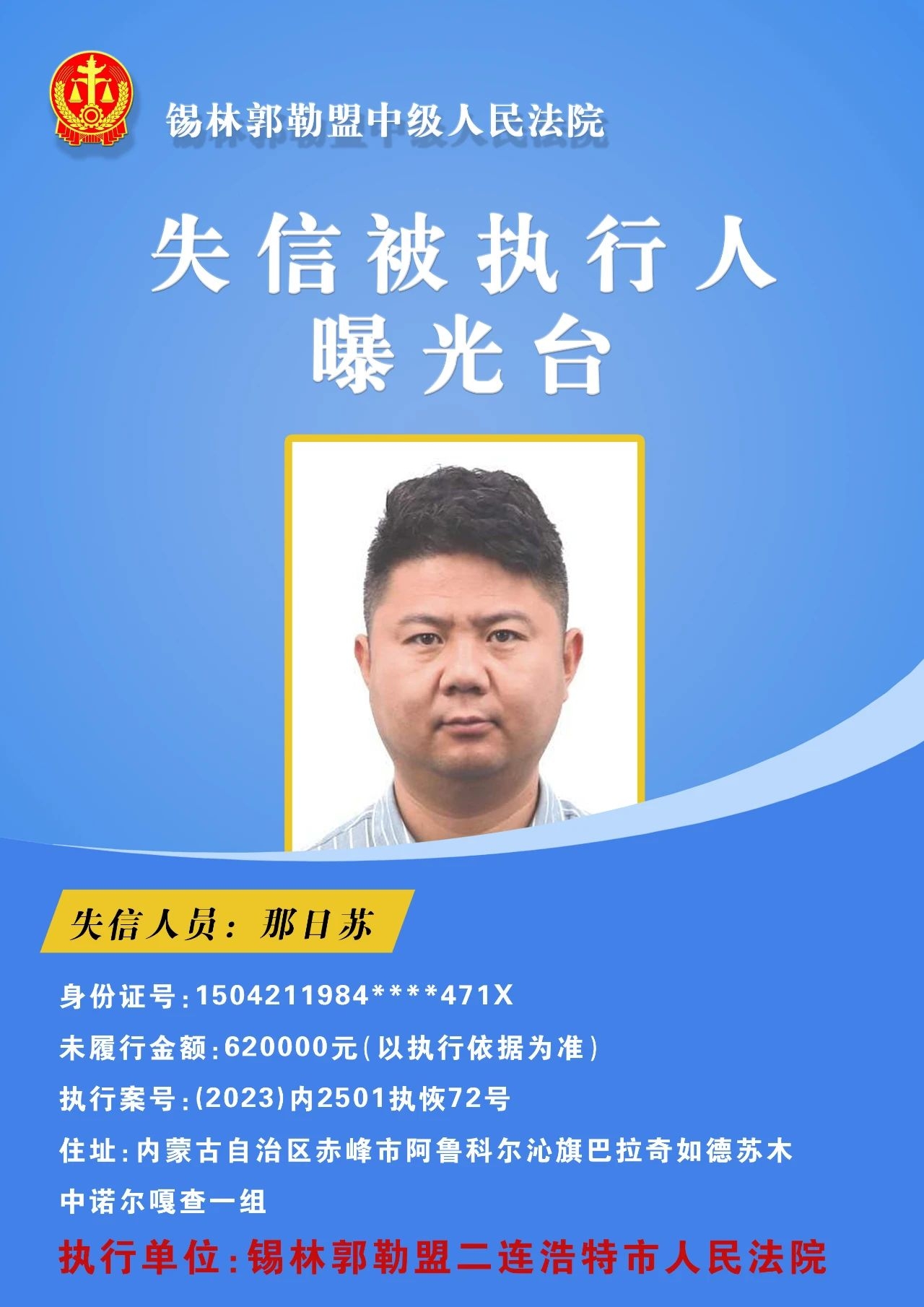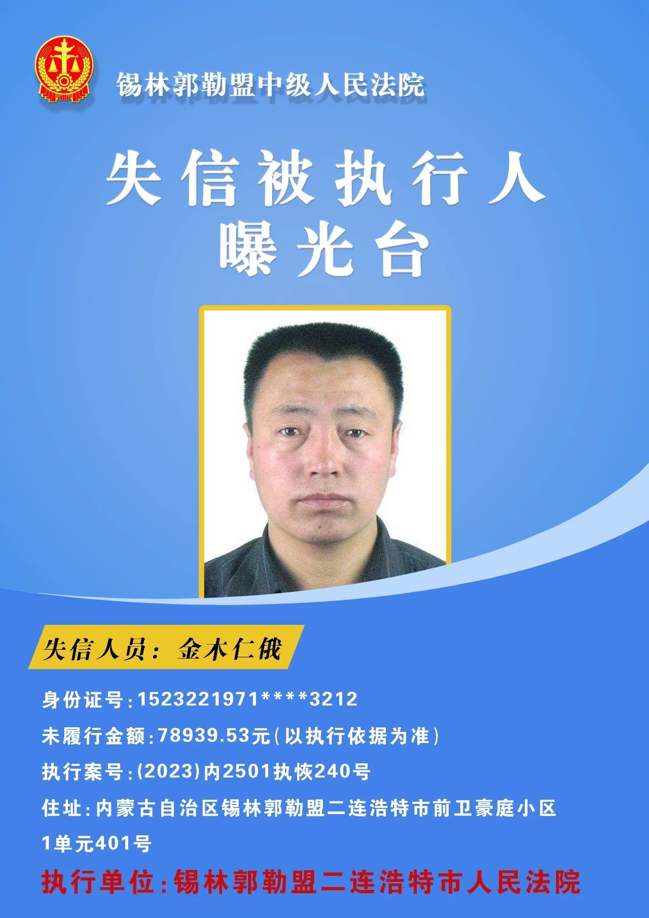为切实保障申请执行人的合法权益,促使被执行人自觉履行生效法律文书确定的义务,推进社会信用体系建设,维护司法权威,根据 《最高人民法院关于公布失信被执行人名单信息的若干规定》的相关规定,经依法审查,现锡林郭勒盟中级人民法院将下列失信被执行人名单予以公布,希望社会各界予以监督,如有发现失信被执行人线索,请及时举报。
