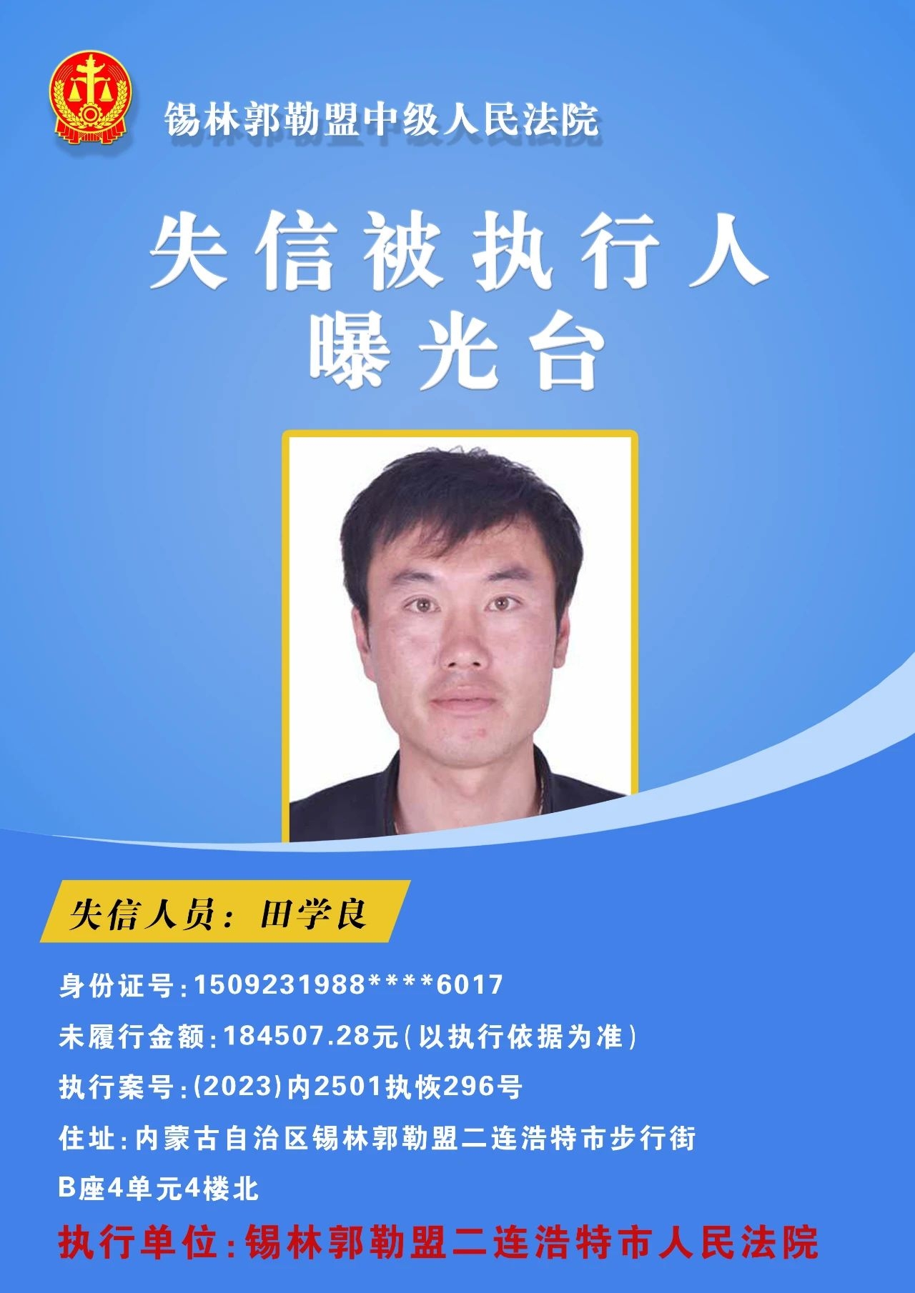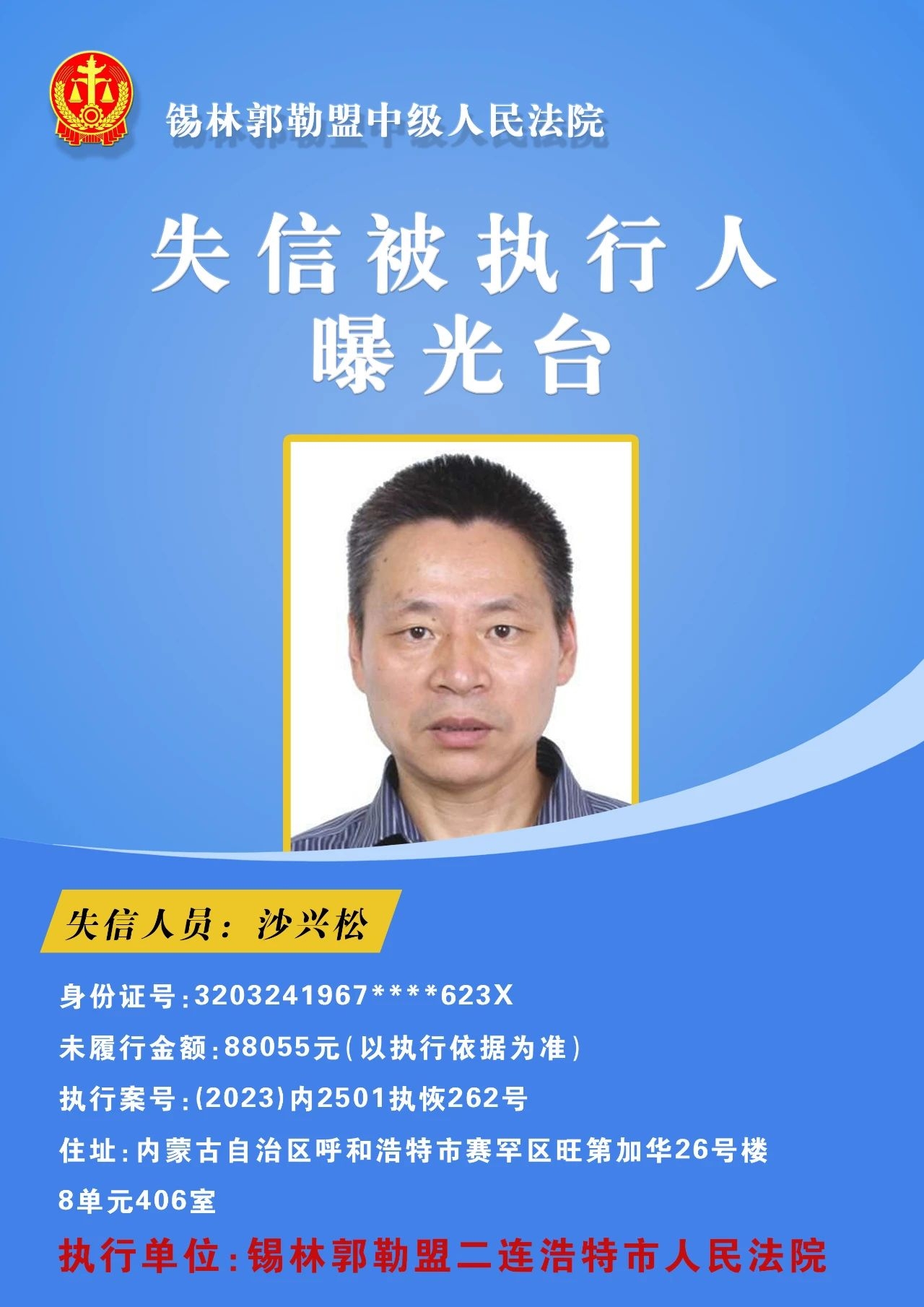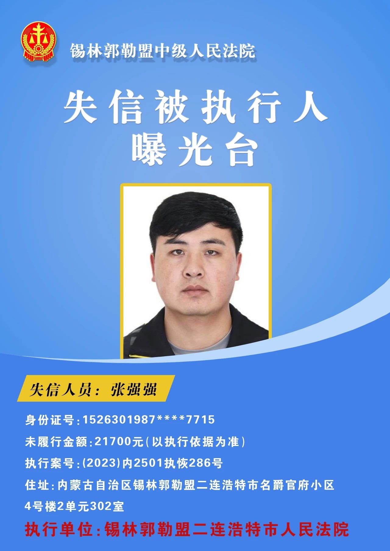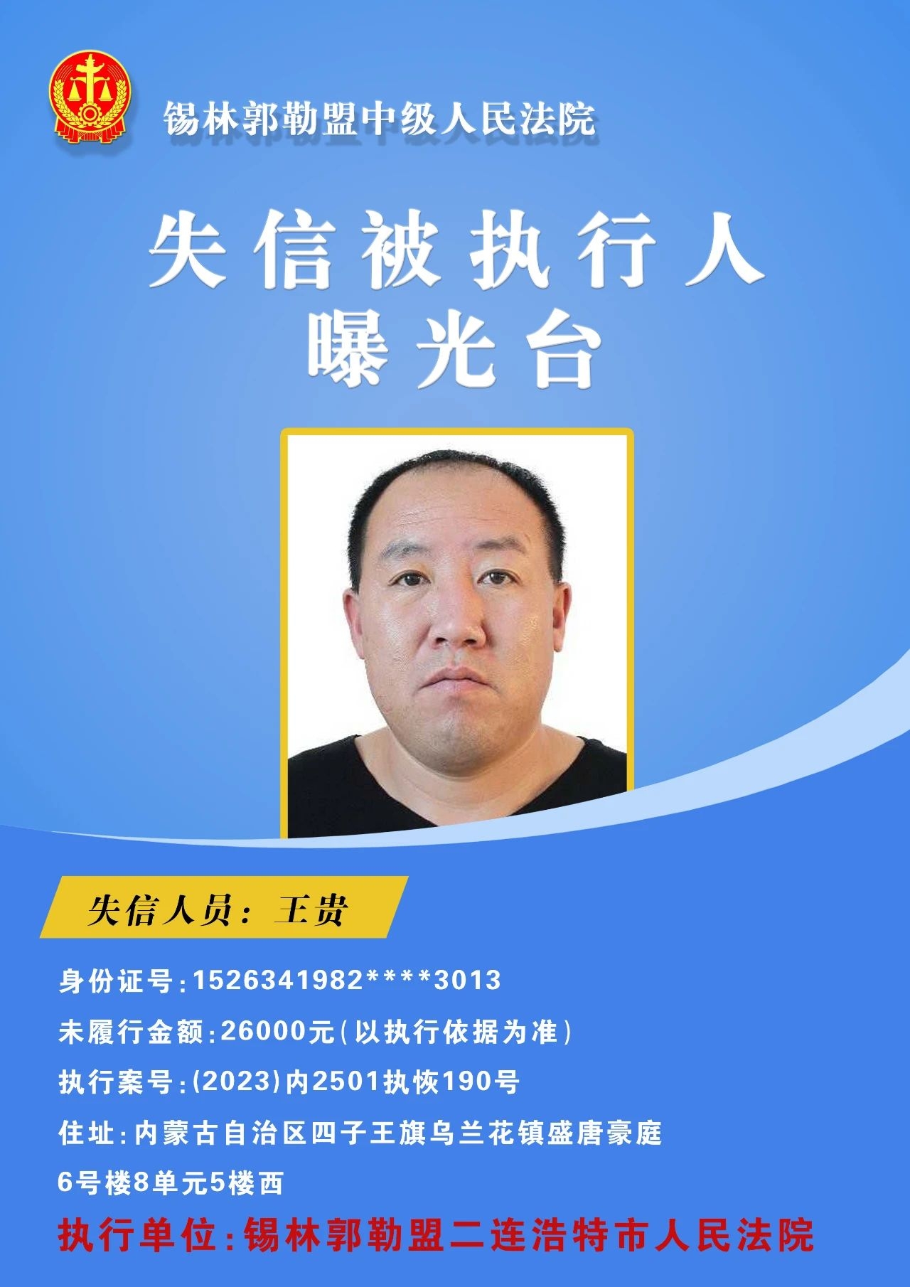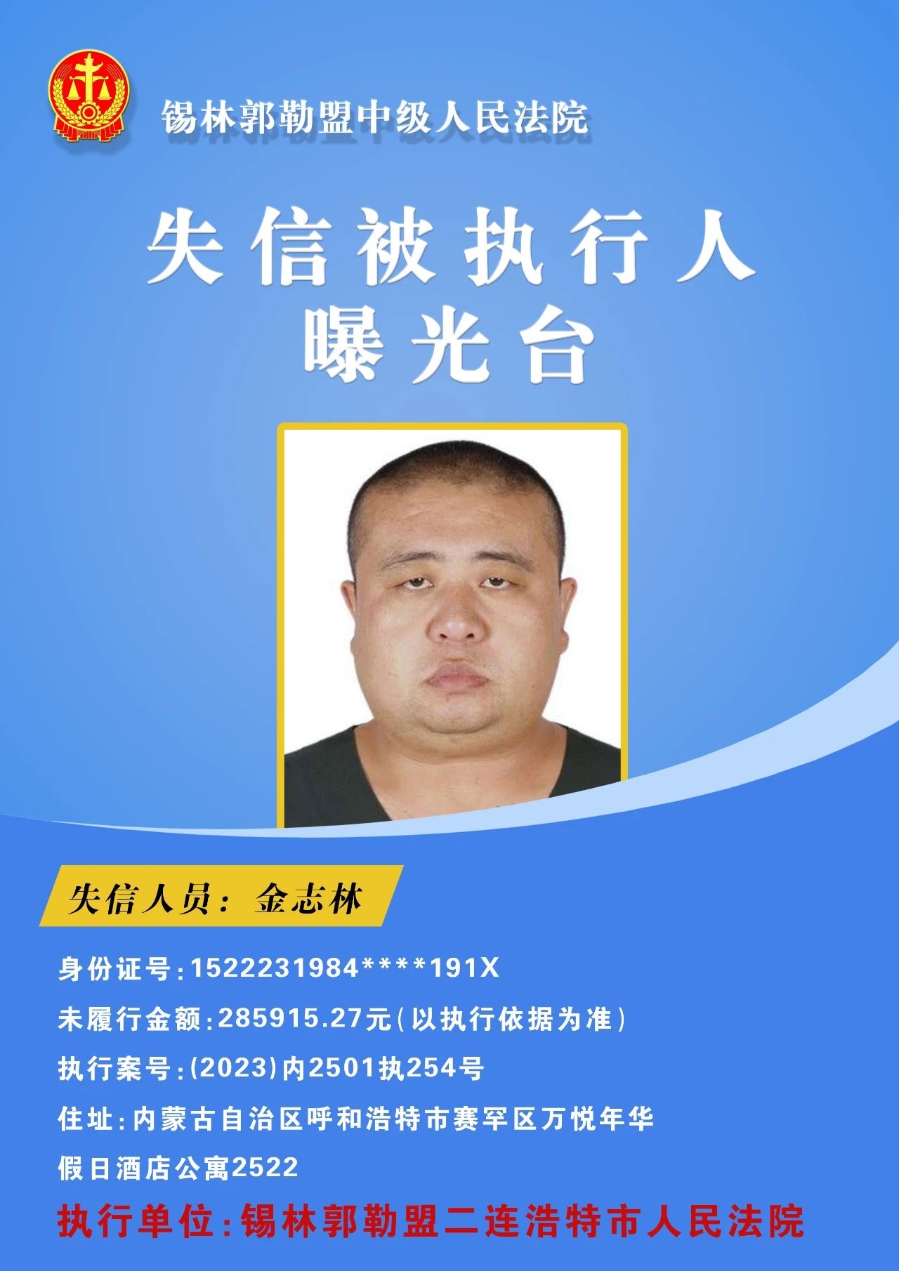 为切实保障申请执行人的合法权益,促使被执行人自觉履行生效法律文书确定的义务,推进社会信用体系建设,维护司法权威,根据 《最高人民法院关于公布失信被执行人名单信息的若干规定》的相关规定,经依法审查,现锡林郭勒盟中级人民法院将下列失信被执行人名单予以公布,希望社会各界予以监督,如有发现失信被执行人线索,请及时举报。