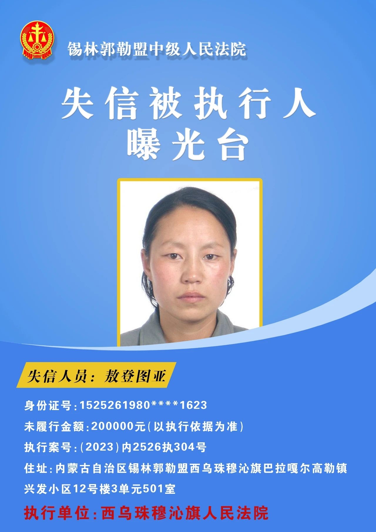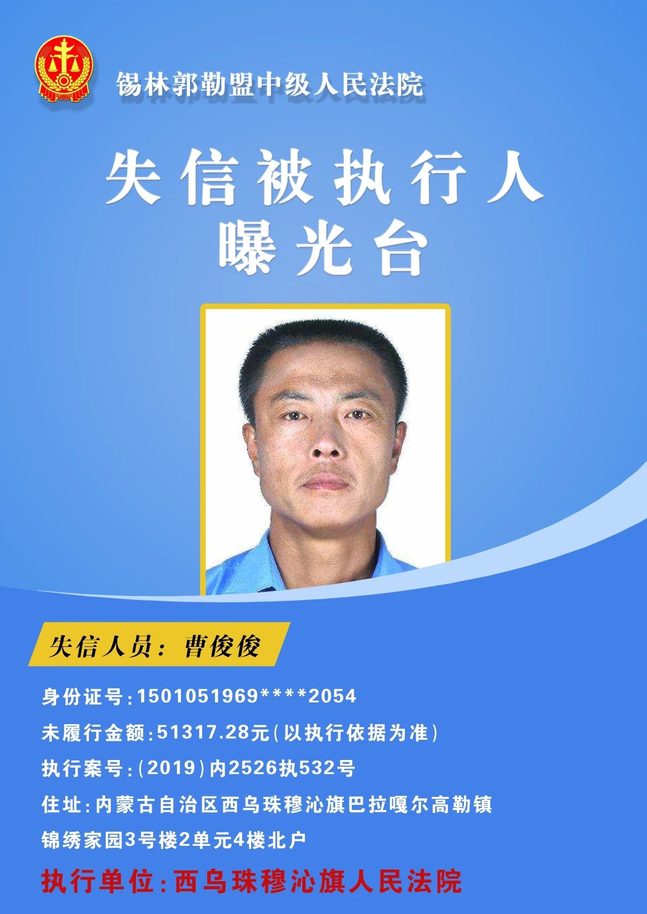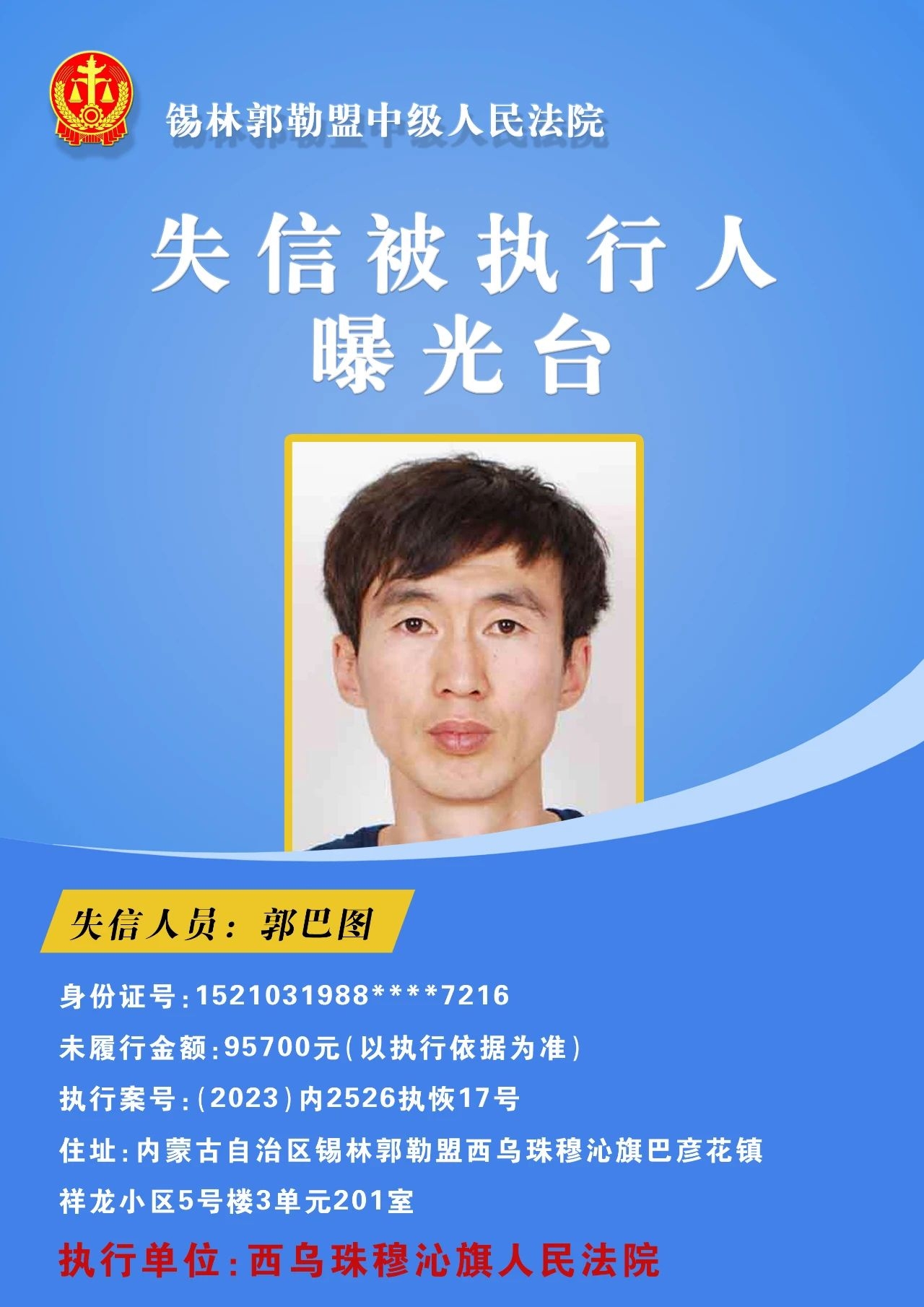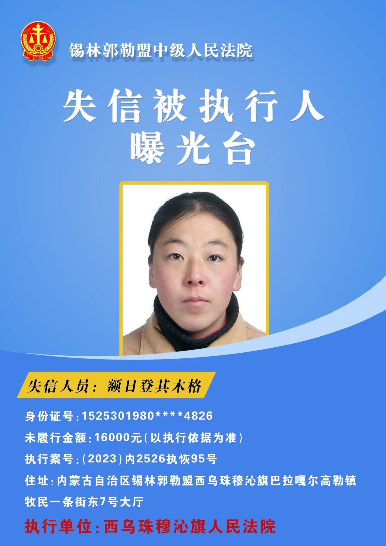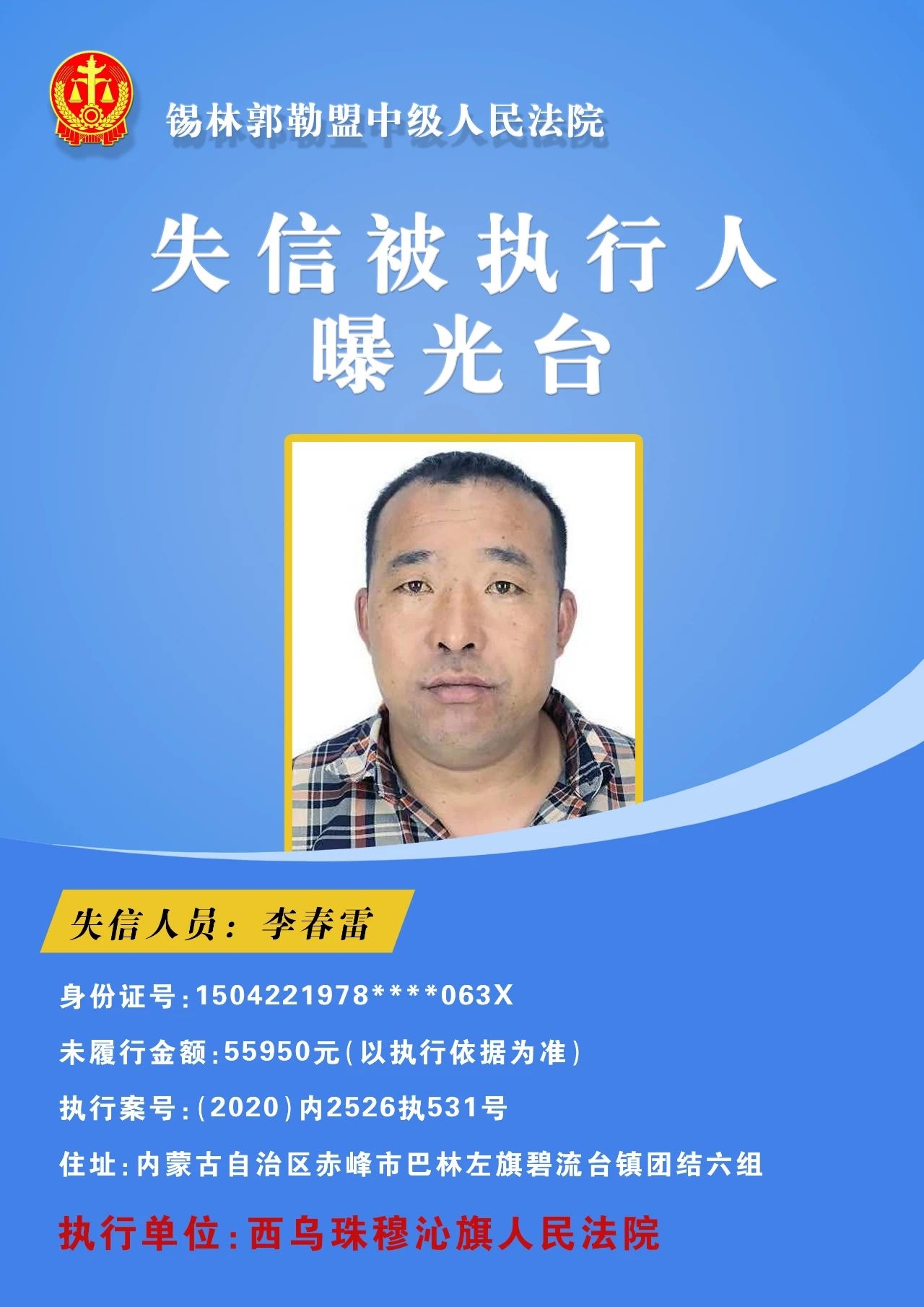 为切实保障申请执行人的合法权益,促使被执行人自觉履行生效法律文书确定的义务,推进社会信用体系建设,维护司法权威,根据 《最高人民法院关于公布失信被执行人名单信息的若干规定》的相关规定,经依法审查,现锡林郭勒盟中级人民法院将下列失信被执行人名单予以公布,希望社会各界予以监督,如有发现失信被执行人线索,请及时举报。