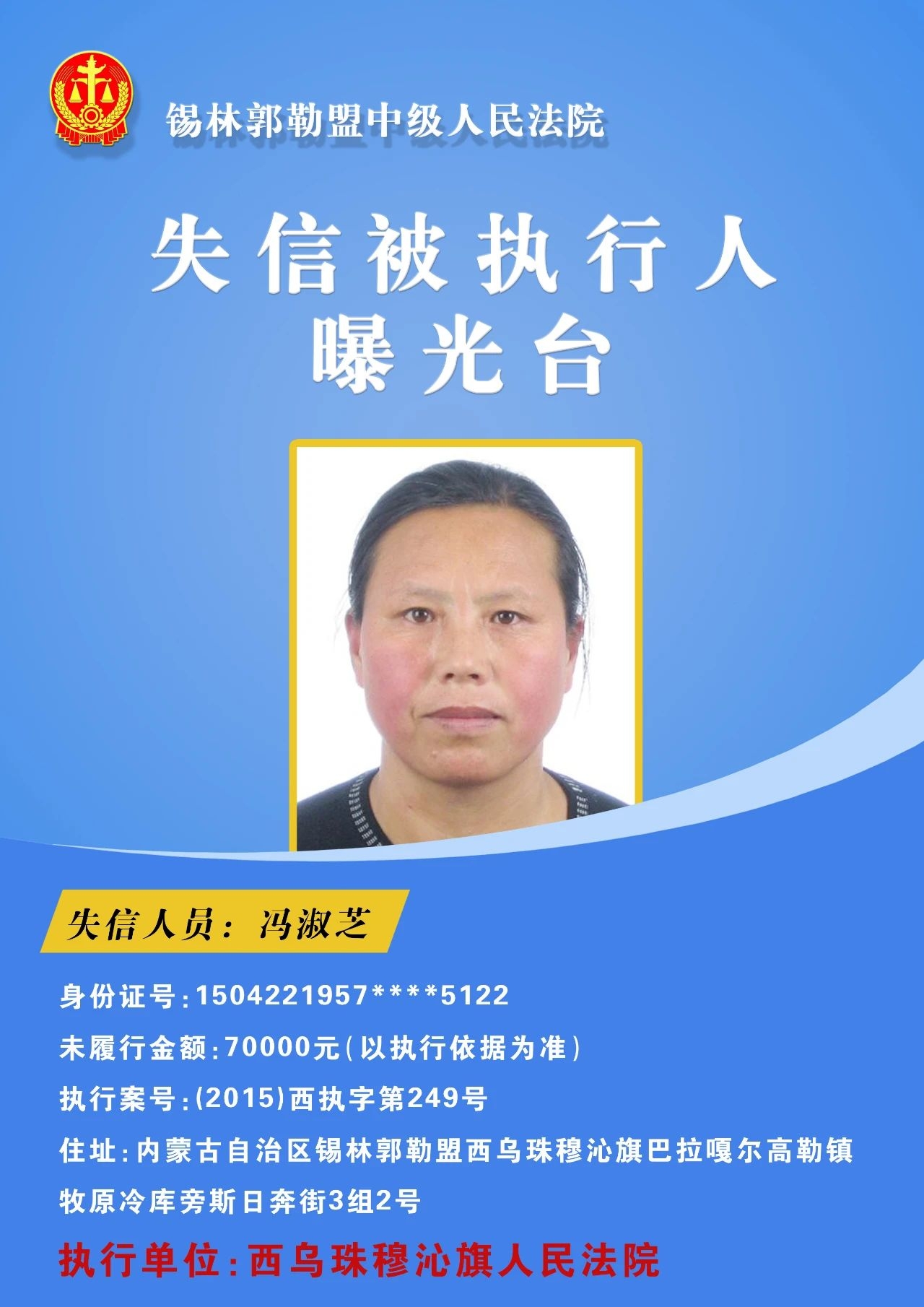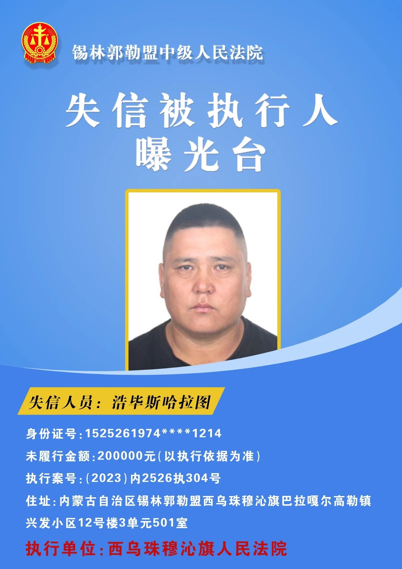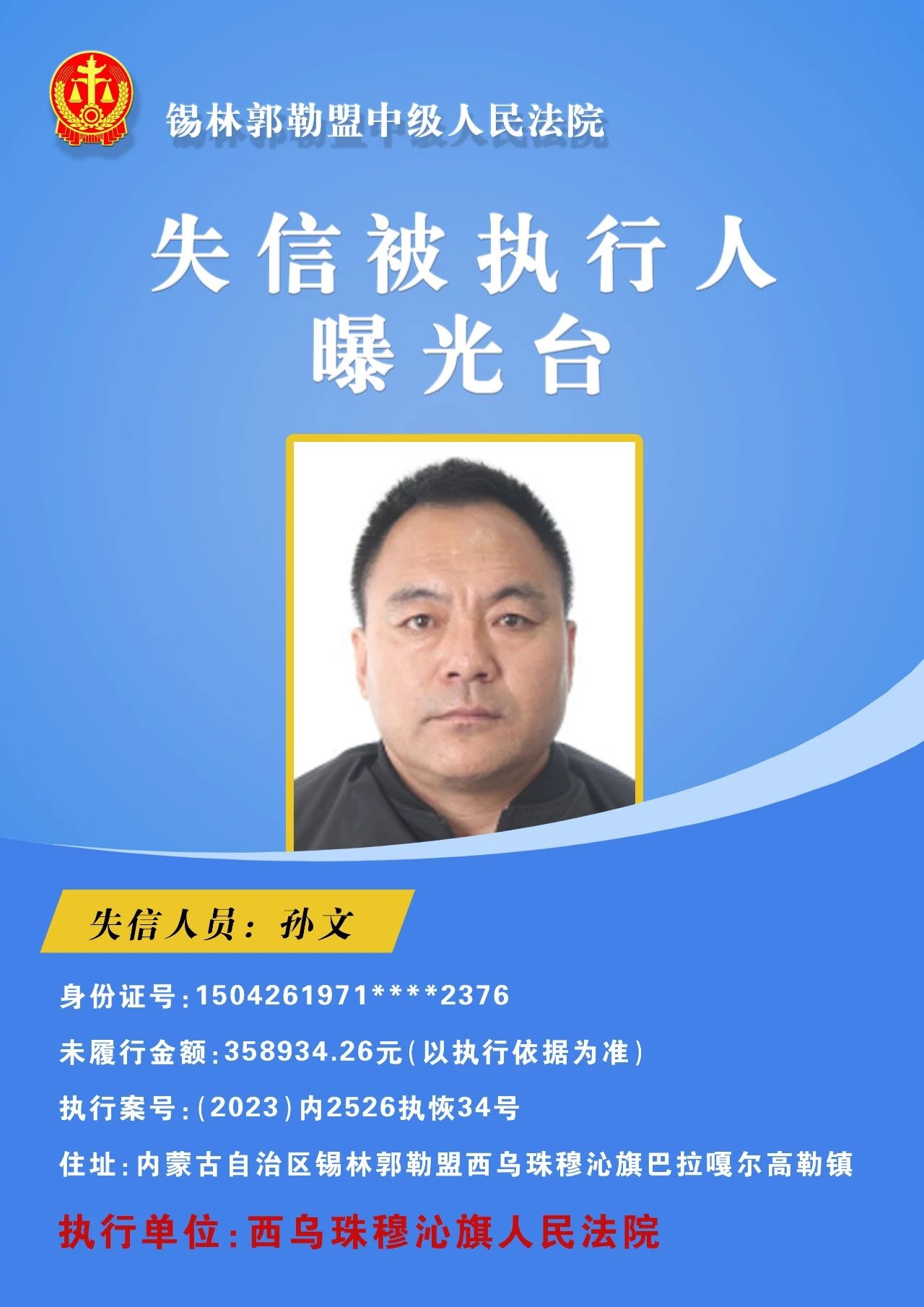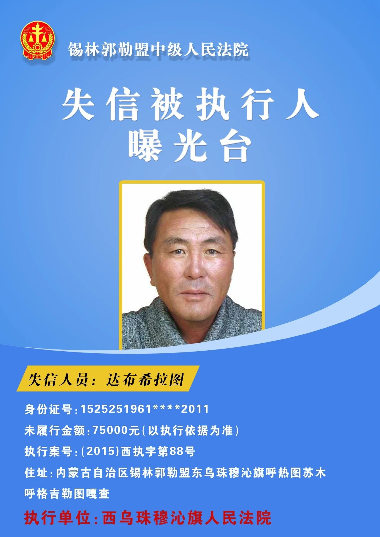 为切实保障申请执行人的合法权益,促使被执行人自觉履行生效法律文书确定的义务,推进社会信用体系建设,维护司法权威,根据 《最高人民法院关于公布失信被执行人名单信息的若干规定》的相关规定,经依法审查,现锡林郭勒盟中级人民法院将下列失信被执行人名单予以公布,希望社会各界予以监督,如有发现失信被执行人线索,请及时举报。
