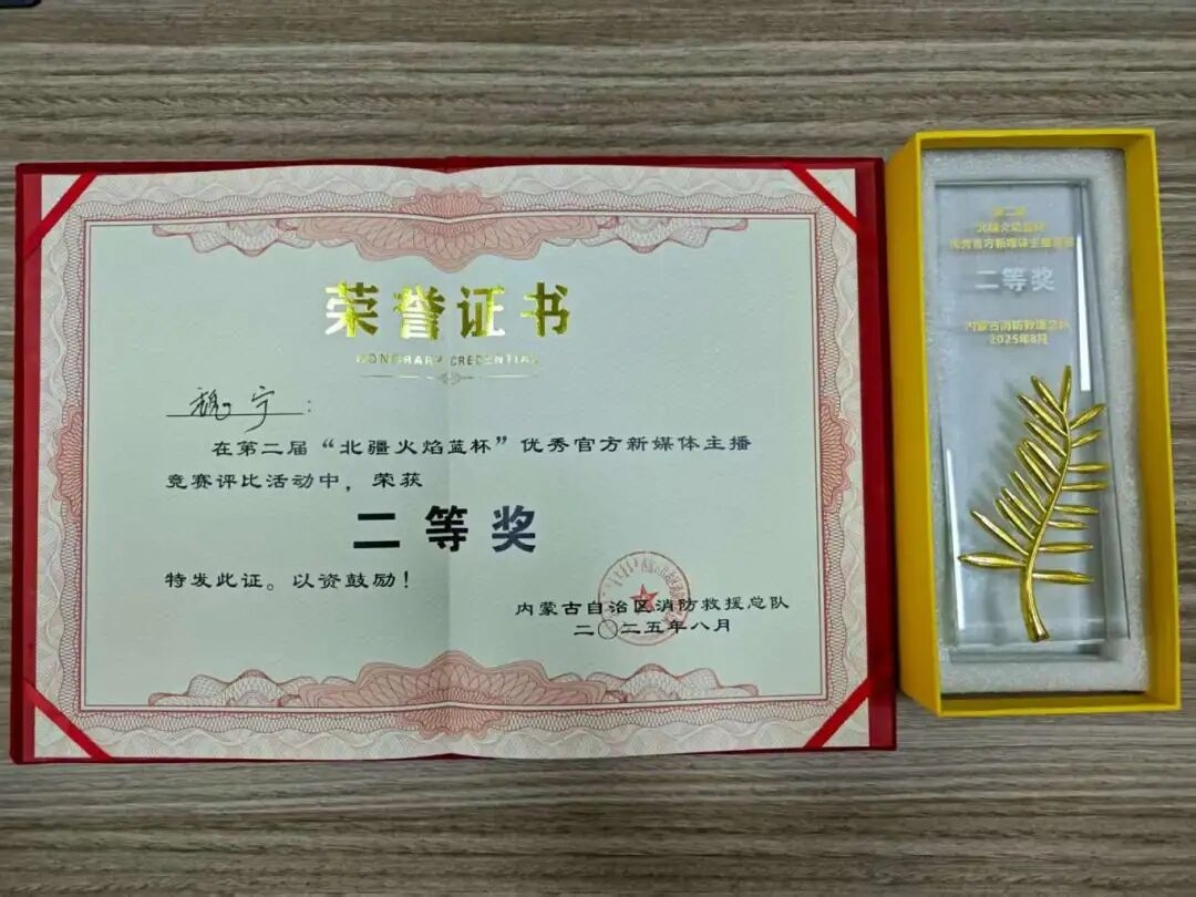 8月29日,在内蒙古自治区消防救援总队主办的第二届 “北疆火焰蓝杯” 优秀官方新媒体主播竞赛评比活动中,支队参赛选手魏宁凭借扎实的专业素养和出色的临场表现,荣获二等奖。