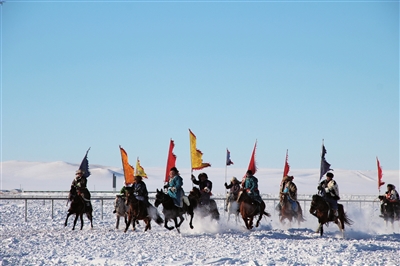 开幕式后,进行了精彩的赛马、赛驼。蒙古马扬鬃奔腾,驰骋在阳光下闪烁着耀眼的光芒;驼峰舞动雪原,在远山的映衬下,显示出另一种壮观。马背拾物、套马、训马,精彩的比赛一个接着一个,大家不停地按下快门,定格每一个精彩瞬间。