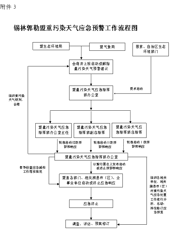 在盟级Ⅲ级响应的基础上,盟应急指挥部向旗县市(区)人民政府下达指令,旗县市(区)指挥部按照当地重污染天气应急预案要求,立即启动预警预报及应急响应措施。同时,加强分析、研判、评估,每日向盟应急指挥部办公室报告有关情况。