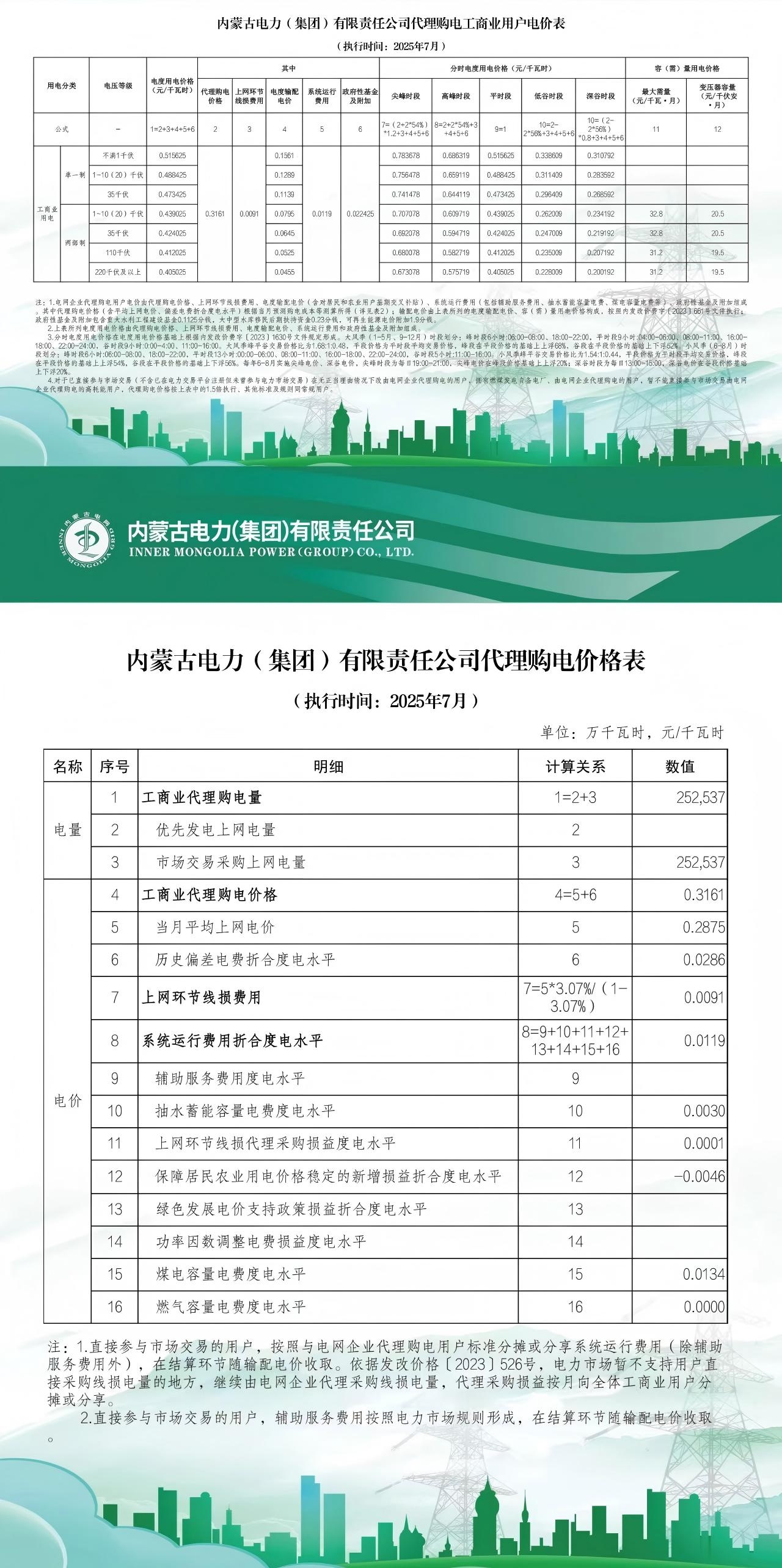 内蒙古电力(集团)有限责任公司关于2025年7月工商业电力客户代理购电价格公告
